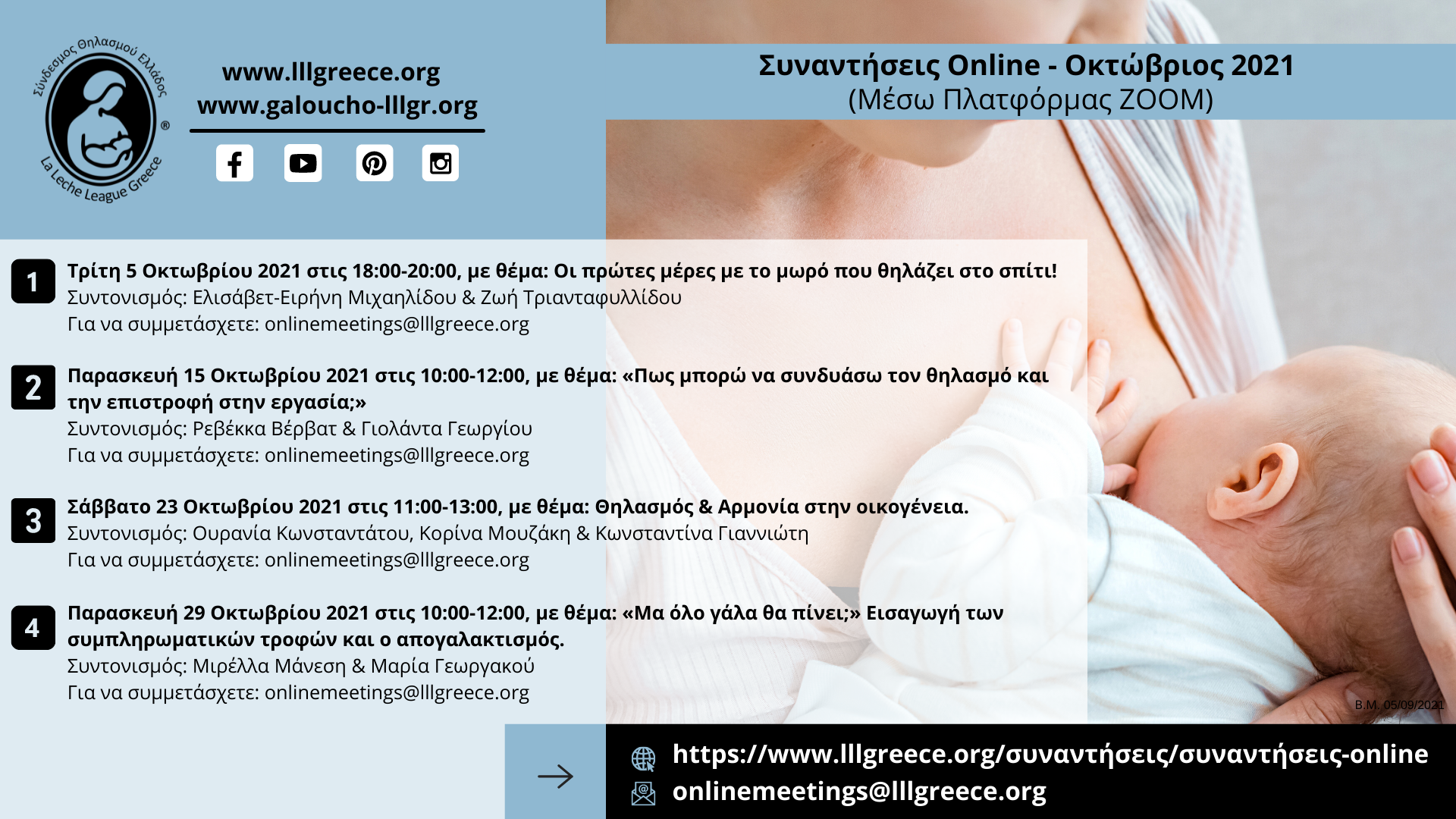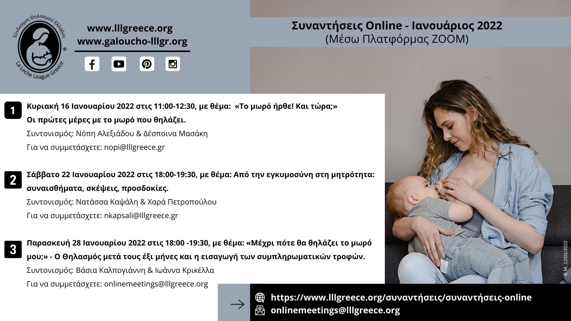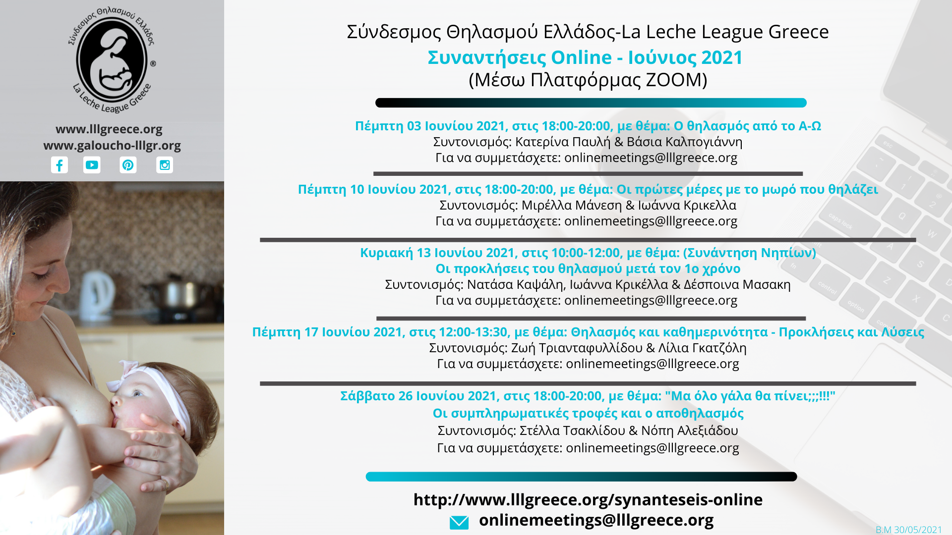 Οι μήνες περνάνε, η πανδημία εξακολουθεί να υπάρχει γύρω μας και κάποιες από τις αλλαγές που έφερε στην καθημερινότητά μας, τελικά ήρθαν για να μείνουν. Ο Σύνδεσμος Θηλασμού Ελλάδος-La Leche League Greece εξακολουθεί να τηρεί τα μέτρα πρόληψης και προστασίας που θέσπισε η ελληνική κυβέρνηση και έτσι συνεχίζει να προσφέρει υποστήριξη, ενθάρρυνση και πληροφόρηση προς όλες τις μητέρες και τις οικογένειες που θέλουν να θηλάσουν τα παιδιά τους, μέσα από τις δωρεάν Διαδικτυακές Συναντήσεις που πραγματοποιούνται στην πλατφόρμα zoom.