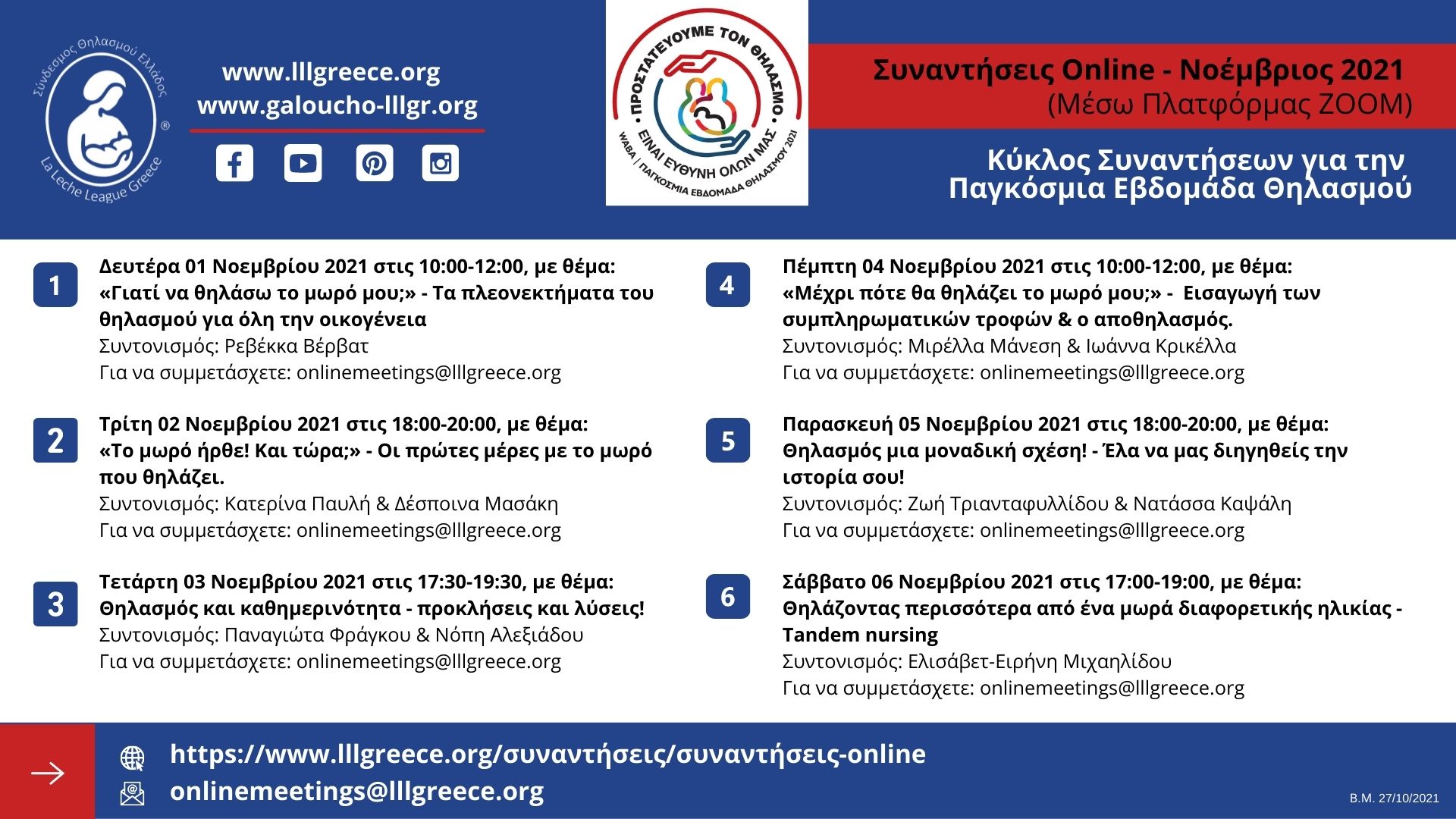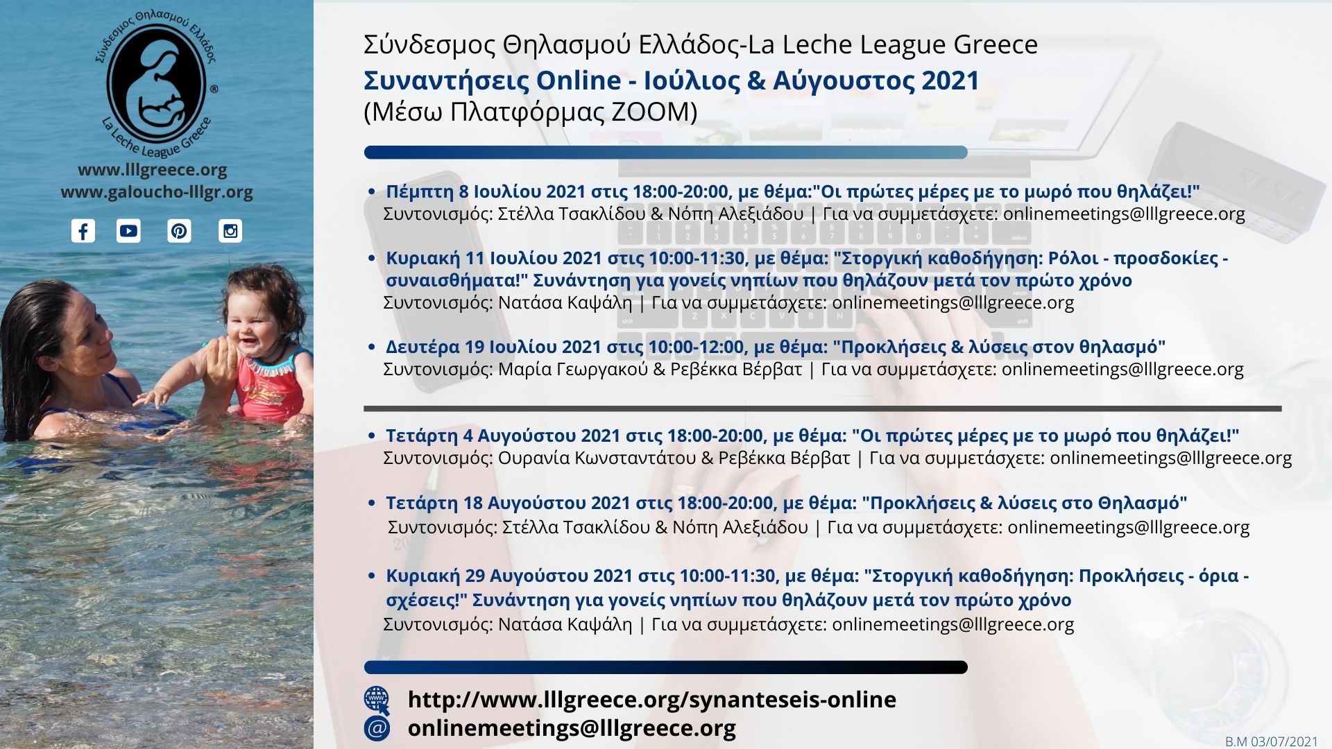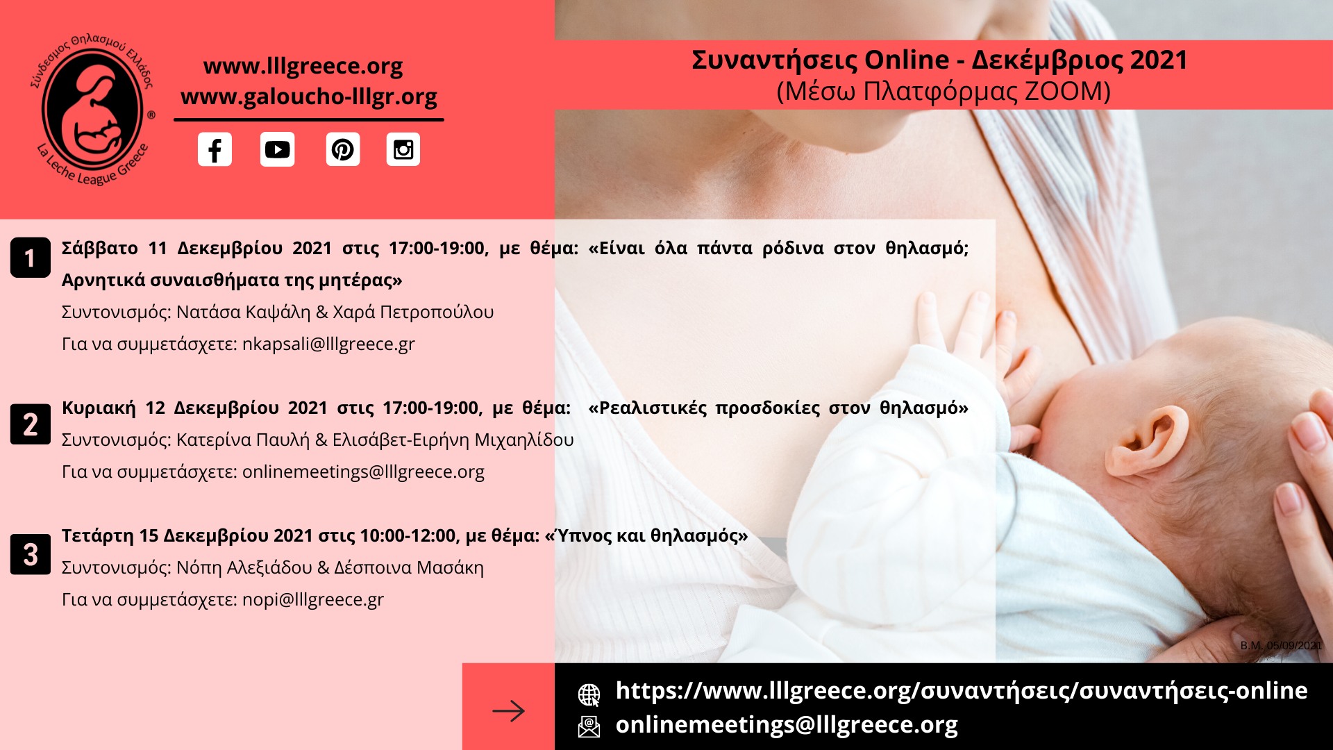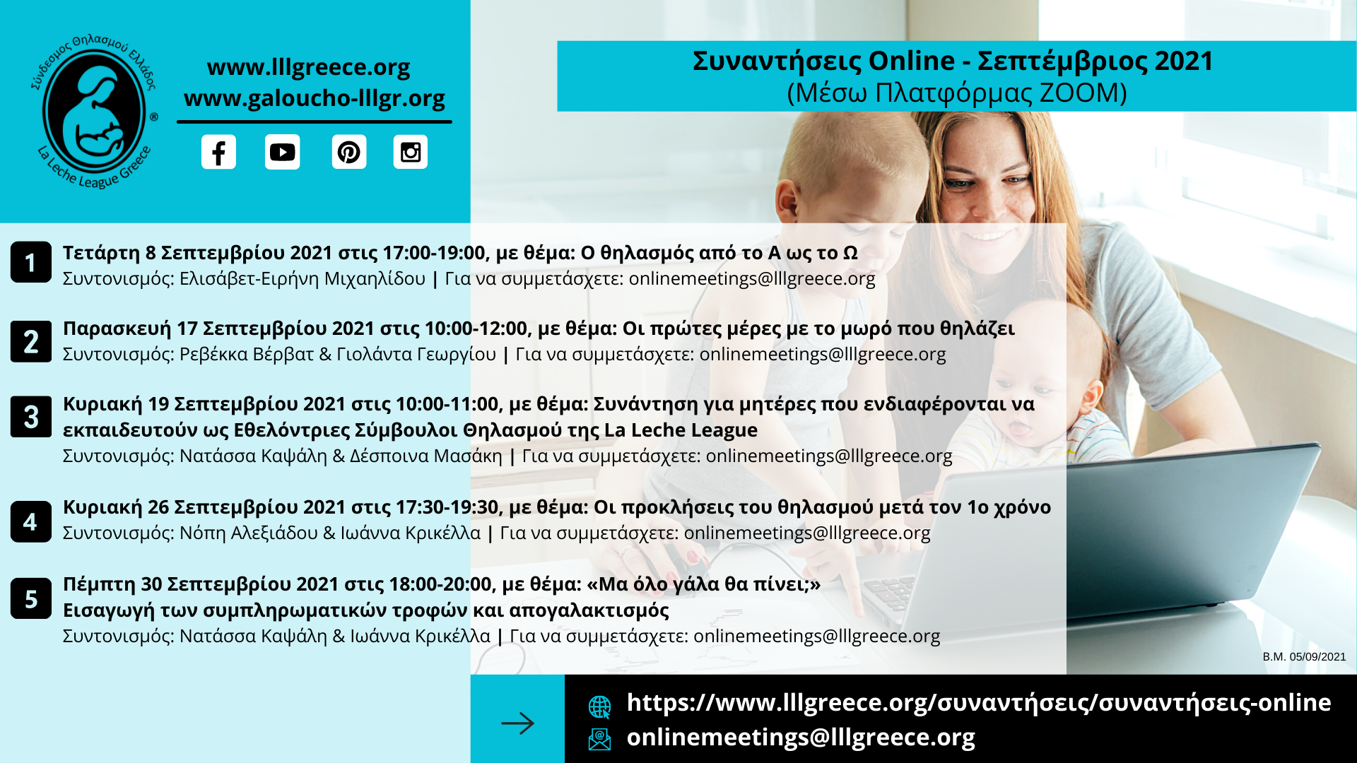 Οι μήνες περνάνε, η πανδημία εξακολουθεί να υπάρχει γύρω μας και κάποιες από τις αλλαγές που έφερε στην καθημερινότητά μας, τελικά ήρθαν για να μείνουν. Ο Σύνδεσμος Θηλασμού Ελλάδος-La Leche League Greece εξακολουθεί να τηρεί τα μέτρα πρόληψης και προστασίας που θέσπισε η ελληνική κυβέρνηση και έτσι συνεχίζει να προσφέρει υποστήριξη, ενθάρρυνση και πληροφόρηση προς όλες τις μητέρες και τις οικογένειες που θέλουν να θηλάσουν τα παιδιά τους, μέσα από τις δωρεάν Διαδικτυακές Συναντήσεις που πραγματοποιούνται στην πλατφόρμα zoom.