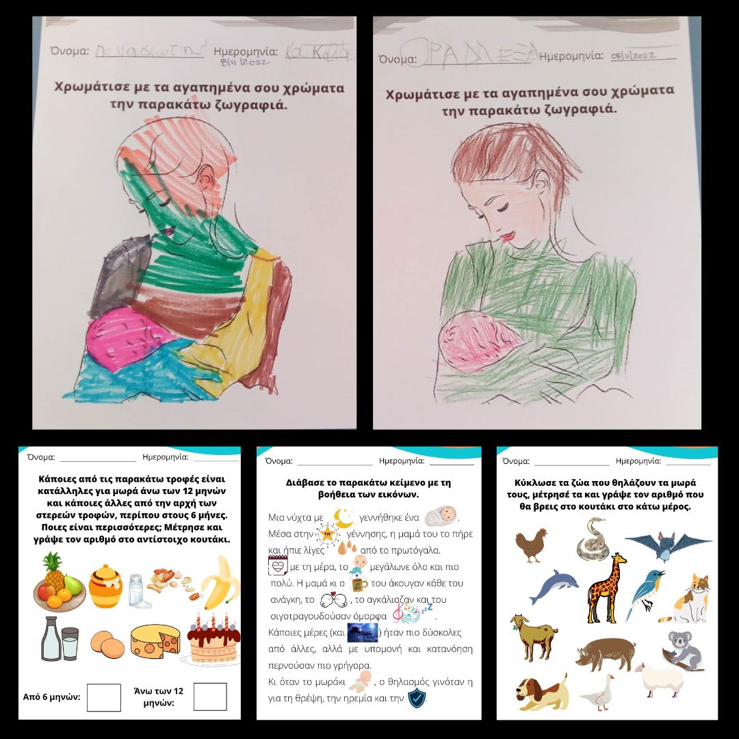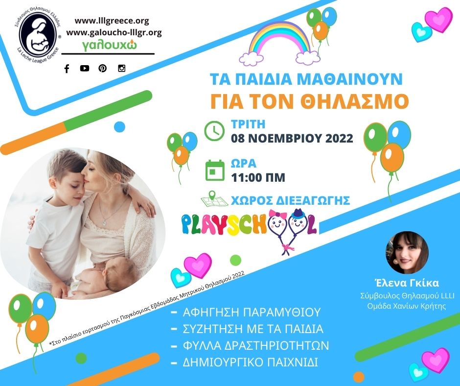 Στο πλαίσιο του εορτασμού της Παγκόσμιας Εβδομάδας Μητρικού Θηλασμού 2022, η LLL Ομάδα Χανίων πραγματοποίησε μια ενημερωτική και διαδραστική επίσκεψη σε ιδιωτικό νηπιαγωγείο της πόλης των Χανίων. Η δράση αυτή έλαβε χώρα την Τρίτη 08 Νοεμβρίου 2022, στις 11:00-12:00, με θέμα «Τα παιδιά μαθαίνουν για τον θηλασμό» από τη Σύμβουλο θηλασμού του Συνδέσμου Θηλασμού Ελλάδος – La Leche League Greece, Έλενα Γκίκα. Η δράση περιλάμβανε αφήγηση παραμυθιού, δημιουργικό παιχνίδι, φύλλα δραστηριοτήτων και συζήτηση με τα παιδιά και τις νηπιαγωγούς. Τα παιδιά έμαθαν για τα οφέλη του θηλασμού για τη μητέρα και το μωρό, για το ποια ζώα είναι θηλαστικά και ποια όχι, ενώ και οι νηπιαγωγοί εμπλούτισαν τις ήδη πλούσιες γνώσεις τους σχετικά με τον θηλασμό. Μια όμορφη συζήτηση ακολούθησε, με το ενδιαφέρον των παιδιών να επικεντρώνεται στη διατροφή της θηλάζουσας μητέρας και του βρέφους, μιας και είχε προηγηθεί τις προηγούμενες μέρες η θεματική ενότητα «Υγιεινή διατροφή» σύμφωνα με το Πρόγραμμα Σπουδών. Από τις πιο όμορφες στιγμές ήταν όταν κάποια από τα παιδιά άρχισαν να μοιράζονται τις δικές τους εμπειρίες (είτε μετά τον ερχομό νεότερου μέλους στην οικογένεια είτε αν θήλασαν τα ίδια, καθώς είχαν ρωτήσει τους γονείς τους την προηγούμενη μέρα). Ήταν μια υπέροχη εμπειρία για όλους, γεγονός που αποδεικνύεται ότι ακόμη και σήμερα, τρεις μήνες μετά τα παιδιά θυμούνται αυτή την επίσκεψη και όλα όσα συζητήσαμε!
