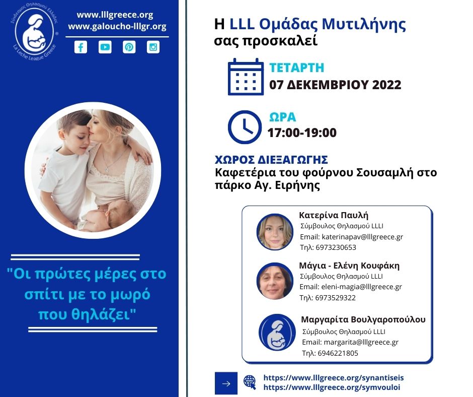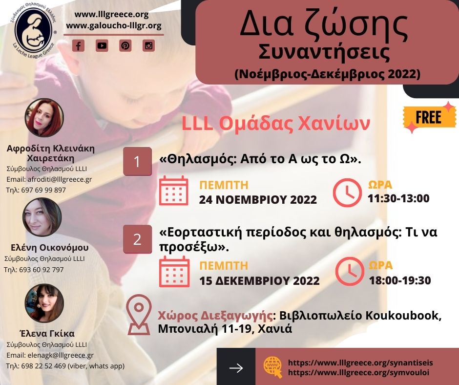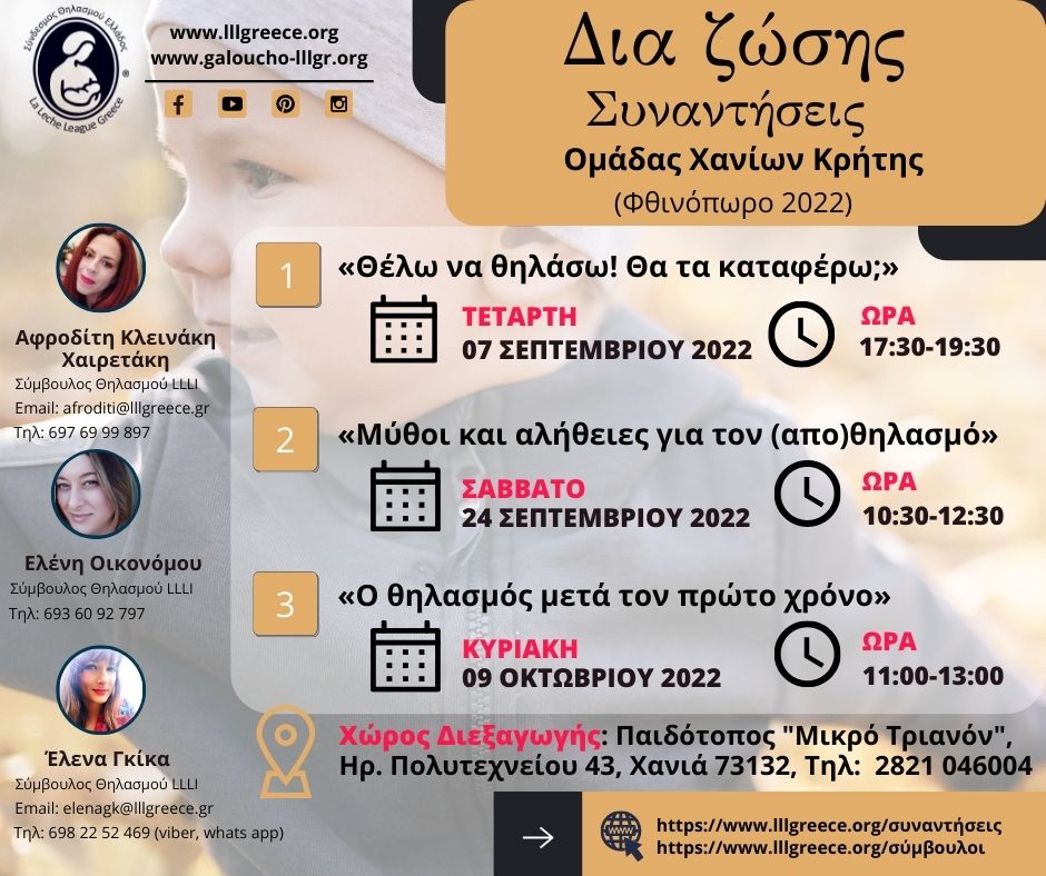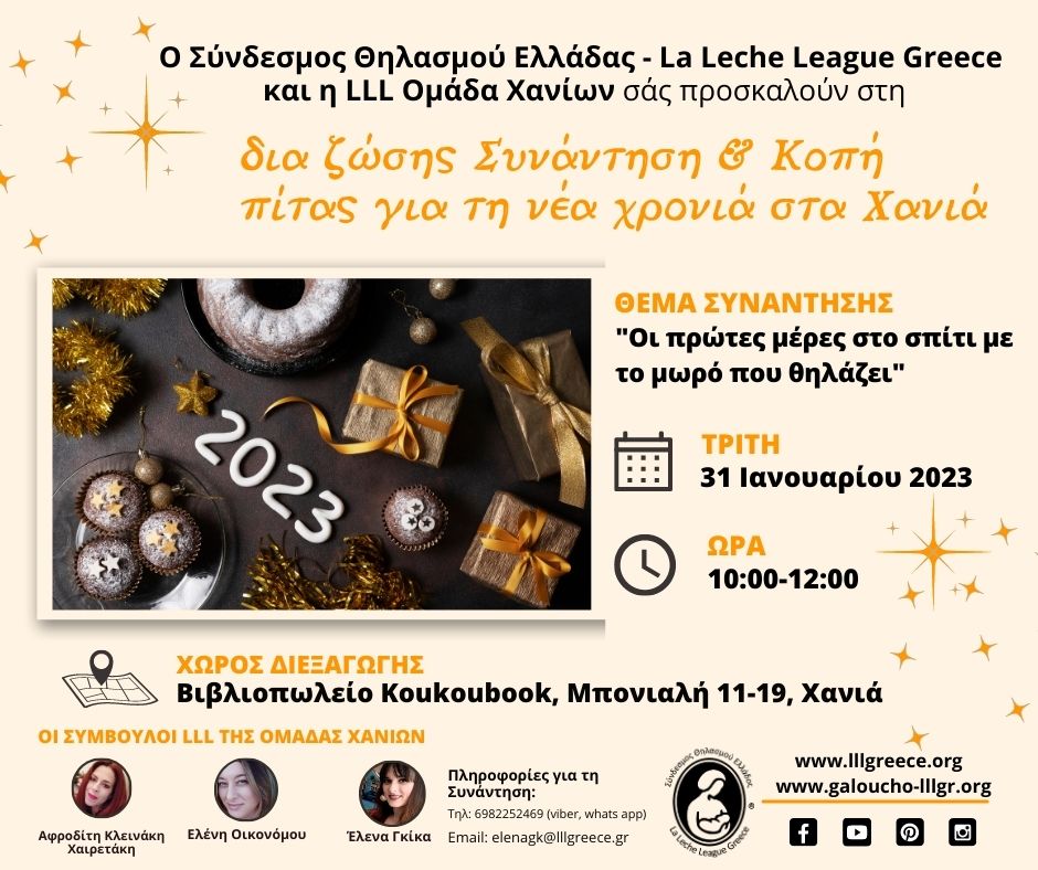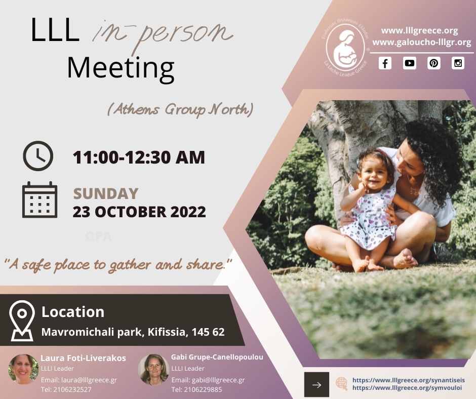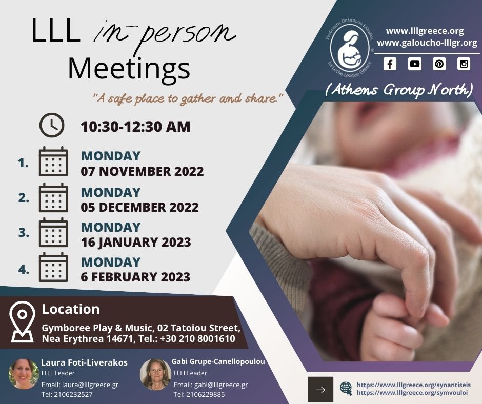 Από τον Αύγουστο του 2022 μέχρι και τον Ιανουάριο του 2023, πραγματοποιήθηκαν 24 δια ζώσης Συναντήσεις σε περισσότερες από δέκα Ομάδες LLL ανά την Ελλάδα, με τις Συμβούλους να καλωσορίζουν παλιά και νέα μέλη με αγάπη, κατανόηση και θετική ενέργεια!