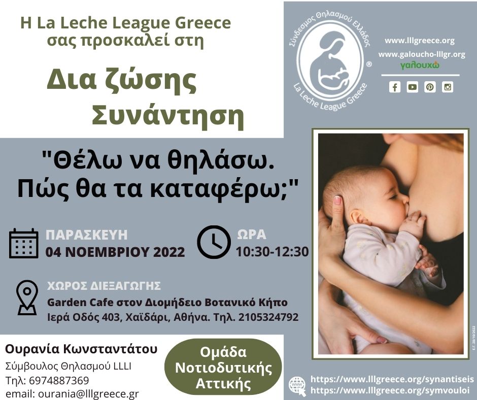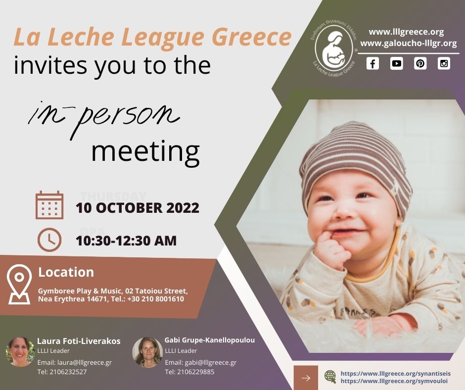 Οι δια ζώσης Συναντήσεις της La Leche League αποτελούν την καρδιά του Συνδέσμου. Είναι ένας μοναδικός χώρος για έγκυρη πληροφόρηση και ενδυνάμωση, ενώ αποτελούν μια πολύ καλή ευκαιρία για νέες φιλίες και γνωριμίες μεταξύ μητέρων που έχουν πολλά κοινά.