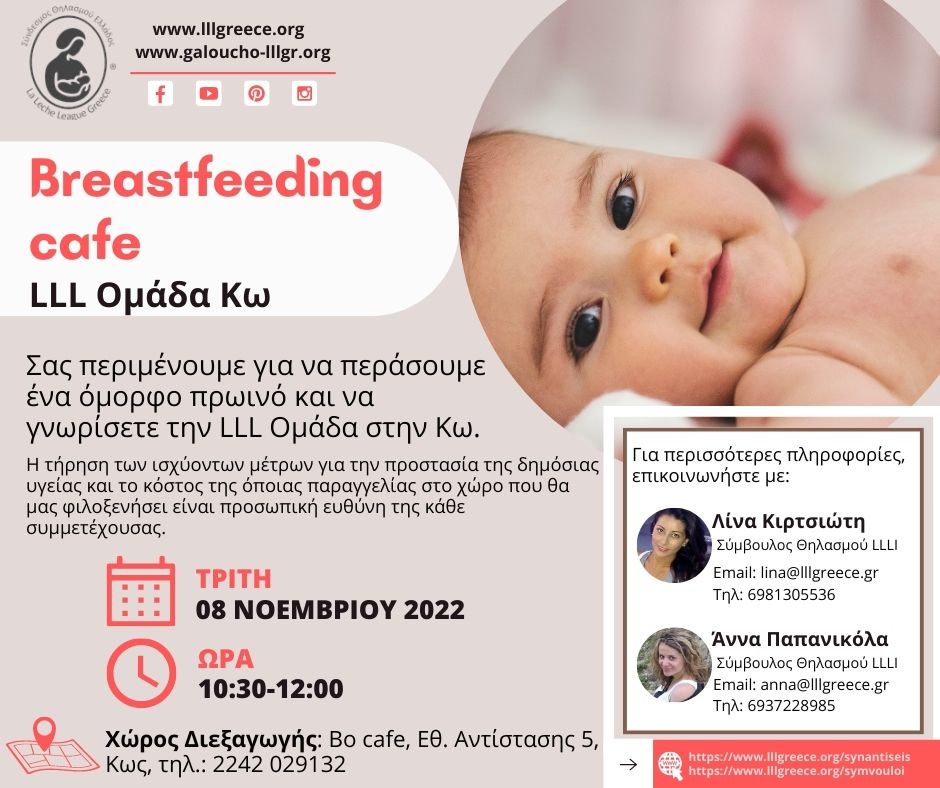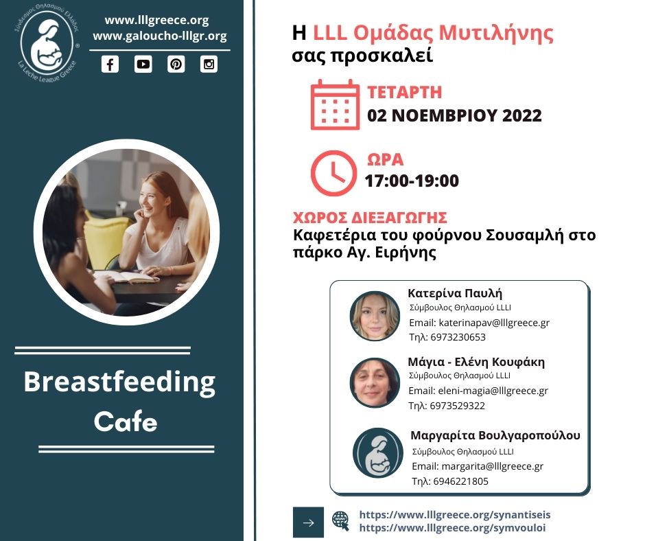 Τα Breastfeeding Cafés είναι μια άλλη μορφή Συναντήσεων της La Leche League, που πραγματοποιούνται σε χώρους εστίασης (καφετέριες, εστιατόρια), με πιο ελεύθερη δομή, καθώς δεν υπάρχει συγκεκριμένο θέμα συζήτησης. Οι μητέρες και οι λοιποί συμμετέχοντες μπορούν να μοιραστούν και να συζητήσουν θέματα που αφορούν στον θηλασμό και τη γονεϊκότητα, με τις Συμβούλους LLL να προσφέρουν επιστημονικά τεκμηριωμένες πληροφορίες, υποστήριξη και ενθάρρυνση.
