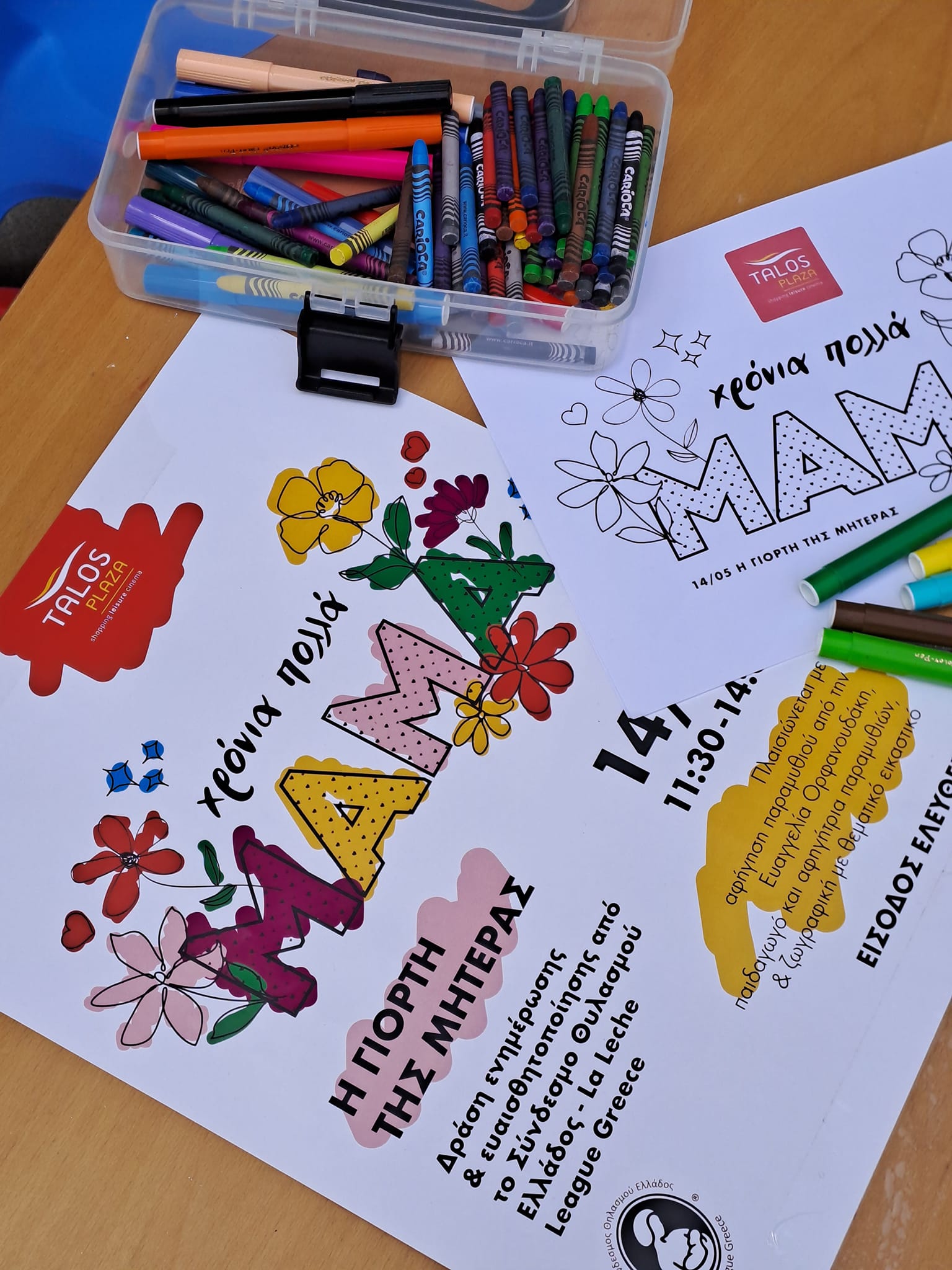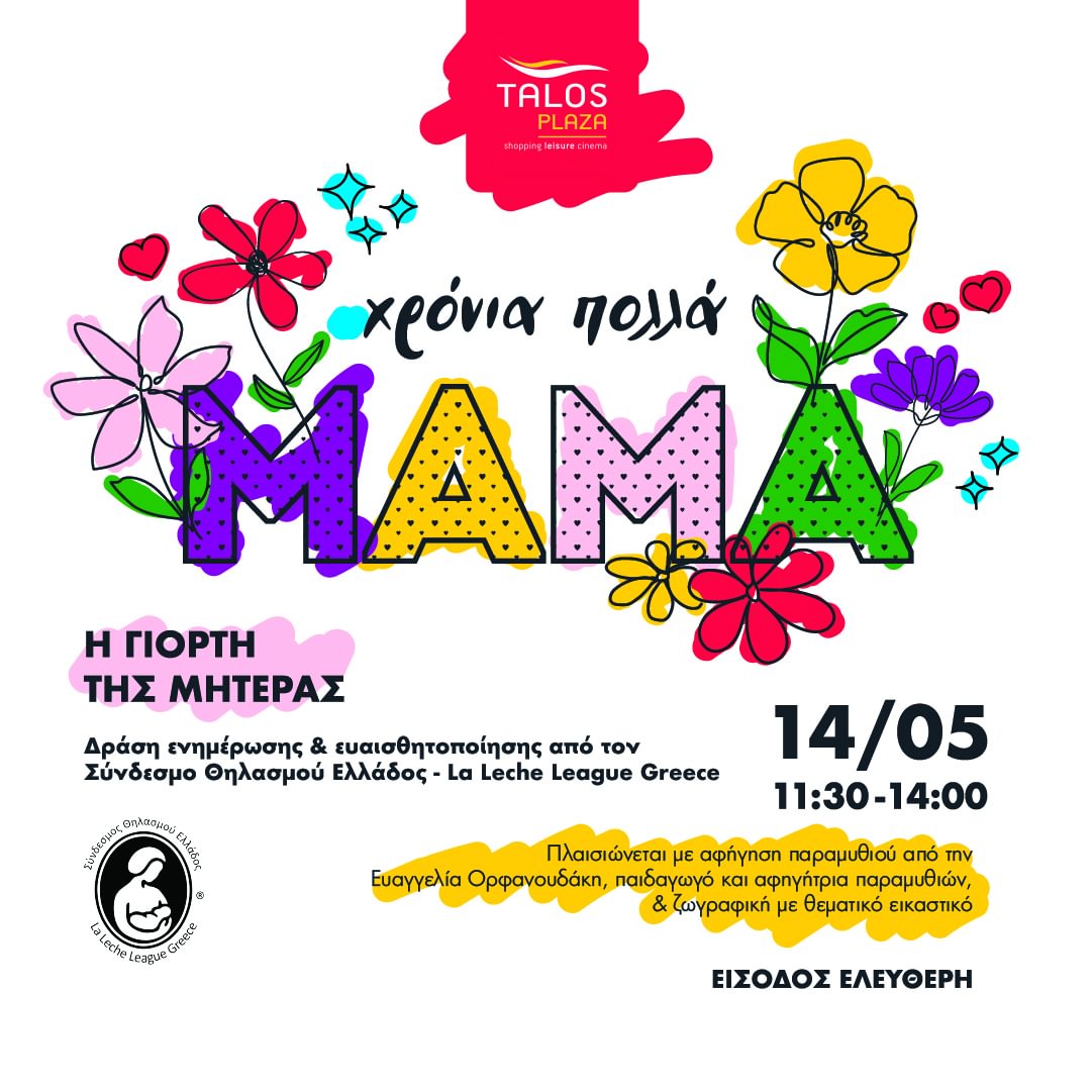 Την Κυριακή 14/05/203 στις 11:30-14:00 τιμήθηκε η Γιορτή της Μητέρας στο TALOS PLAZA με μια δράση ενημέρωσης και ευαισθητοποίησης, η οποία θα πλαισιώθηκε με αφήγηση παραμυθιού από την EvAngelia Orfanoudaki, παιδαγωγό και αφηγήτρια παραμυθιού, καθώς και ζωγραφική με θεματικό εικαστικό. Παράλληλα, οι Σύμβουλοι LLL της τοπικής Ομάδας του Συνδέσμου Θηλασμού Ελλάδος-La Leche League Greece, Θεοδώρα Χατζηδάκη και Στέλλα Τσακλίδου ήταν στη διάθεση του κοινού για ενημέρωση και συζήτηση σχετικά με τα όσα τους απασχολούν γύρω από τον θηλασμό.