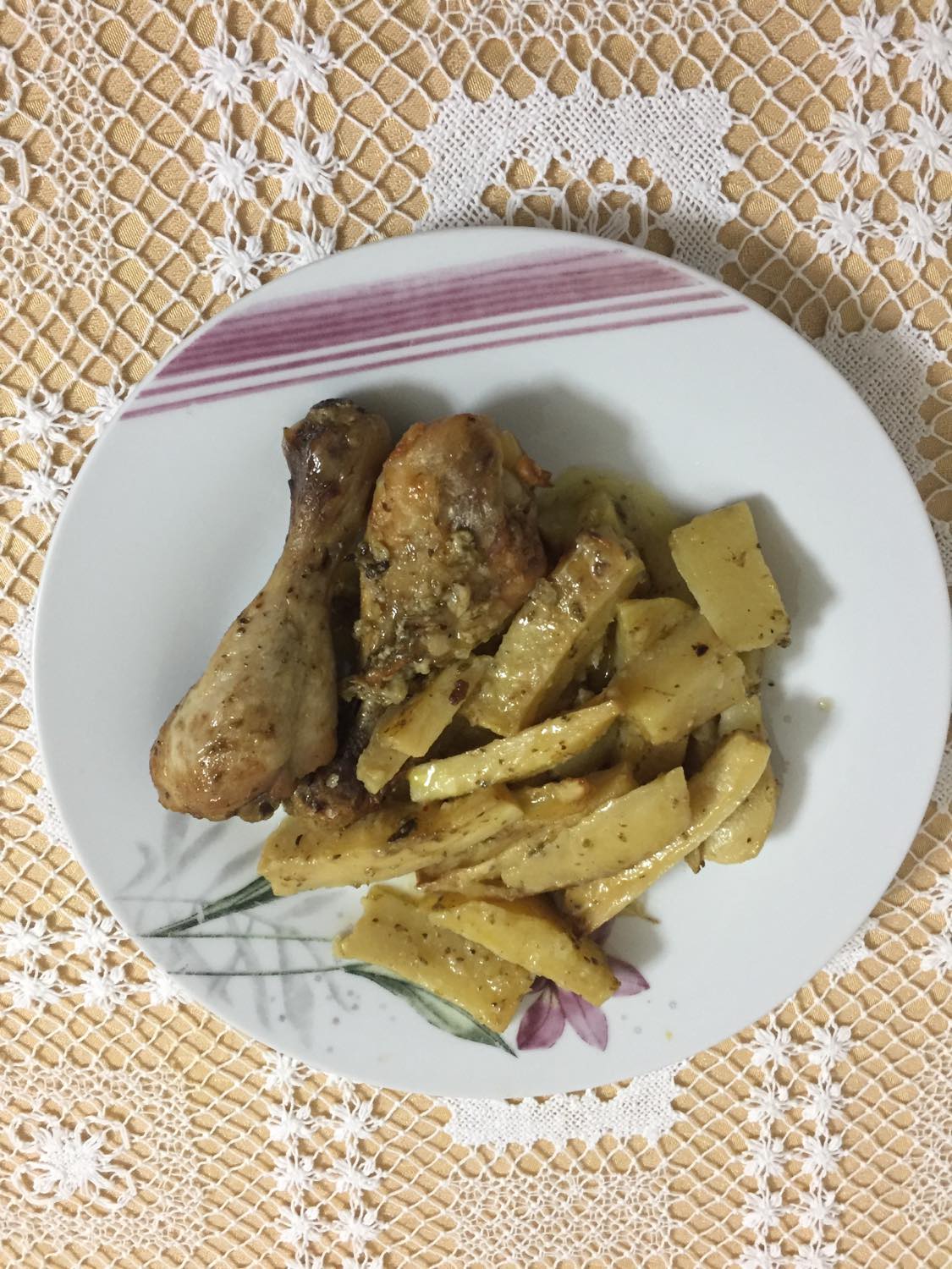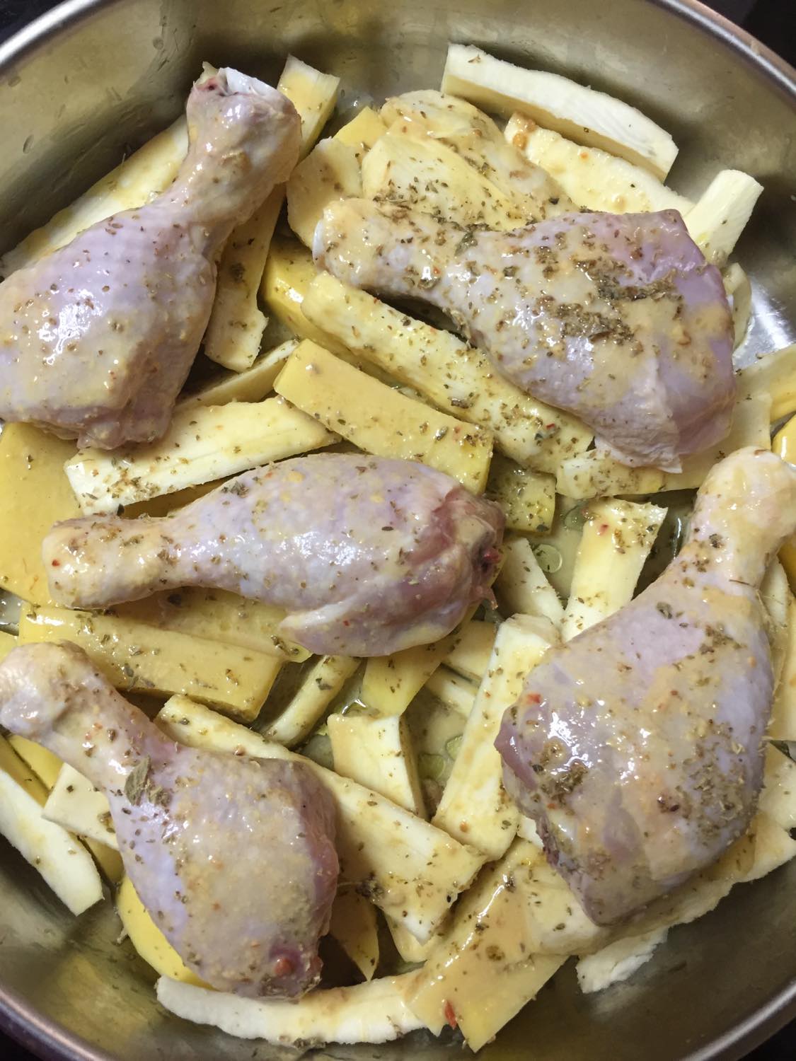Ανακατέψτε σε ένα ποτήρι τη μουστάρδα, το λεμόνι, τη ρίγανη, αλάτι και πιπέρι της αρεσκείας σας και το νερό και περιχύστε το φαγητό με το μείγμα. Προσθέστε από πάνω το λάδι. Εάν θέλετε για αρχή κάντε τη δικιά σας συνταγή για κοτόπουλο με πατάτες στον φούρνο όπως την έχουν συνηθίσει οι δικοί σας, απλά προσθέστε και μια παστινάκη.