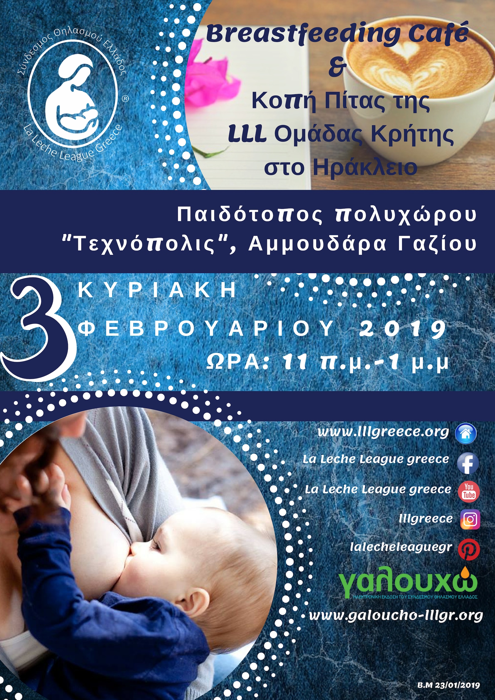 Η LLL Ομάδα Ηρακλείου Κρήτης πραγματοποίησε την Κυριακή 03 Φεβρουαρίου 2019, στον Παιδότοπο του πολυχώρου “Τεχνόπολις”, στην Αμμουδάρα Γαζίου,  Breastfeeding Café και κοπή πίτας της Ομάδας!