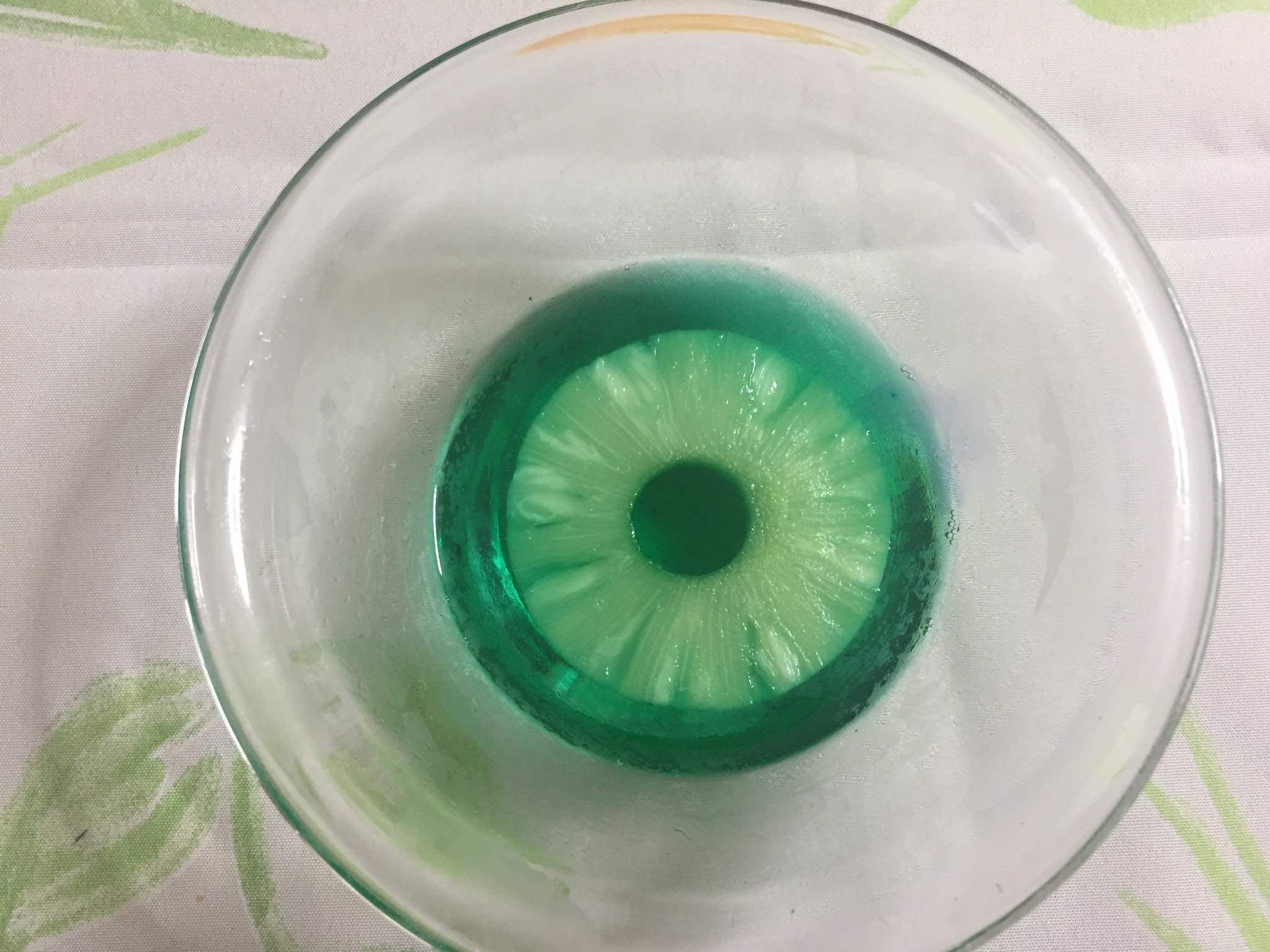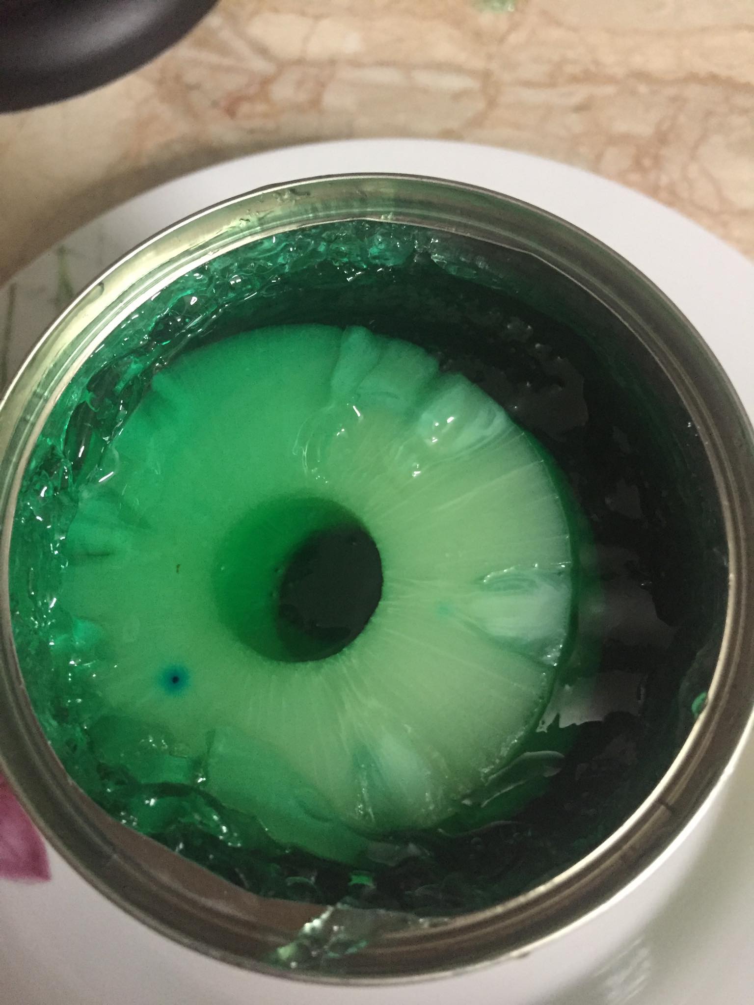 Ανακατέψτε πολύ καλά μέχρι να λιώσει το ζελέ. Εάν θέλετε να έχει διαφορετικό χρώμα για να κάνει αντίθεση με τις φέτες ανανά προσθέστε δύο σταγόνες από το χρώμα ζαχαροπλαστικής της αρεσκείας σας. Ρίξτε το ζελέ μέσα στην κονσέρβα πάνω από τα δαχτυλίδια ανανά. Μόλις το βάλετε στην κονσέρβα τα δαχτυλίδια ανανά θα αρχίσουν να επιπλέουν. Γι’ αυτό κεντραρίστε τα και βάλτε από πάνω κάτι βαρύ ώστε να τα κρατάει ευθυγραμμισμένα στο κέντρο της κονσέρβας.