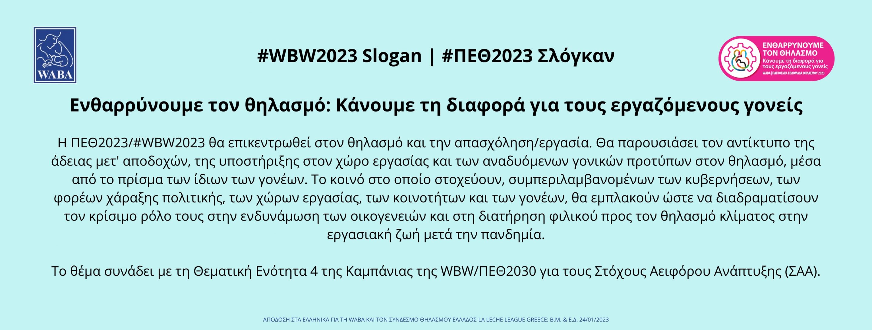 H ΠΕΘ2023/#WBW2023 θα επικεντρωθεί στον θηλασμό και την απασχόληση/εργασία. Θα παρουσιάσει τον αντίκτυπο της άδειας μετ’ αποδοχών, της υποστήριξης στον χώρο εργασίας και των αναδυόμενων γονικών προτύπων στον θηλασμό, μέσα από το πρίσμα των ίδιων των γονέων.