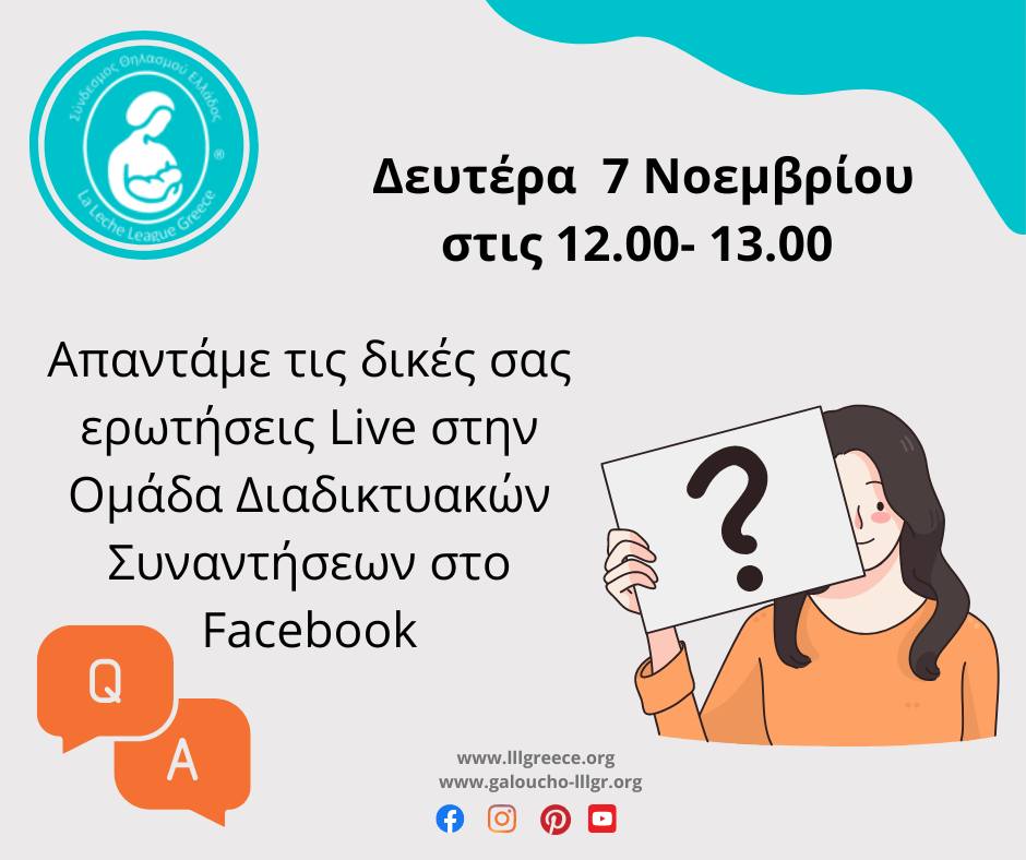 Η Ομάδα Διαδικτυακών Συναντήσεων στο Facebook, η μοναδική ομάδα του Συνδέσμου Θηλασμού Ελλάδος σε αυτό το μέσο κοινωνικής δικτύωσης, πραγματοποίησε Συνάντηση τη Δευτέρα 7 Νοεμβρίου στο πλαίσιο της Παγκόσμιας Εβδομάδας Θηλασμού 2022. Μια Συνάντηση λίγο διαφορετική από τις προηγούμενες Συναντήσεις. Η Σύμβουλος της La Leche League, Ελισάβετ-Ειρήνη Μιχαηλίδου, συνδέθηκε live από τις 12 μ.μ. έως τη 1 μ.μ., για να απαντήσει σε ερωτήματα που είχαν θέσει οι μητέρες γραπτώς. Τη Συνάντηση αυτή παρακολούθησαν 146 μέλη. Η ανταπόκριση των μελών ήταν πολύ ενθαρρυντική και ελπίζουμε να γίνουν και άλλες αντίστοιχες Facebook-live Συναντήσεις στο επόμενο διάστημα.
