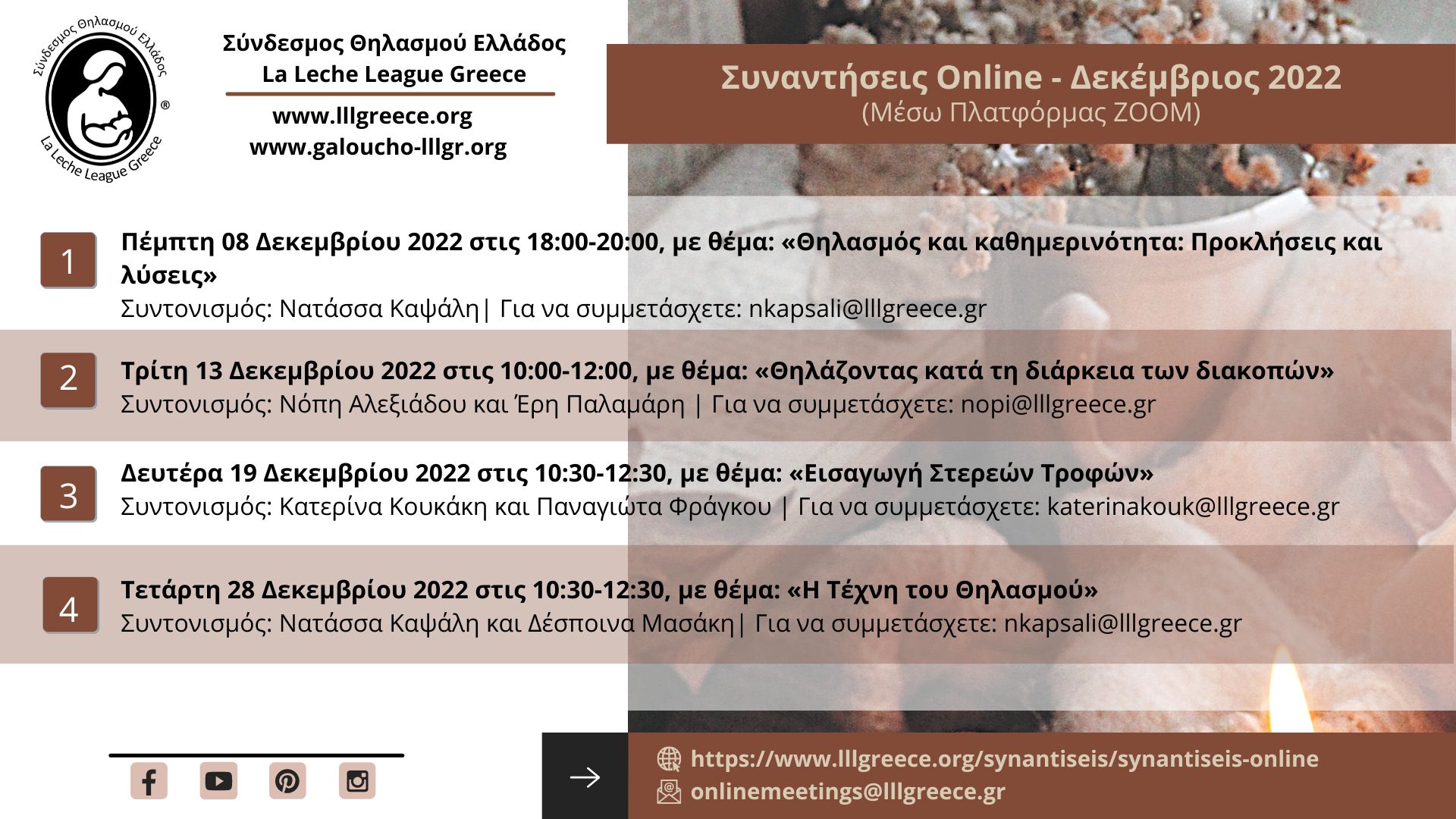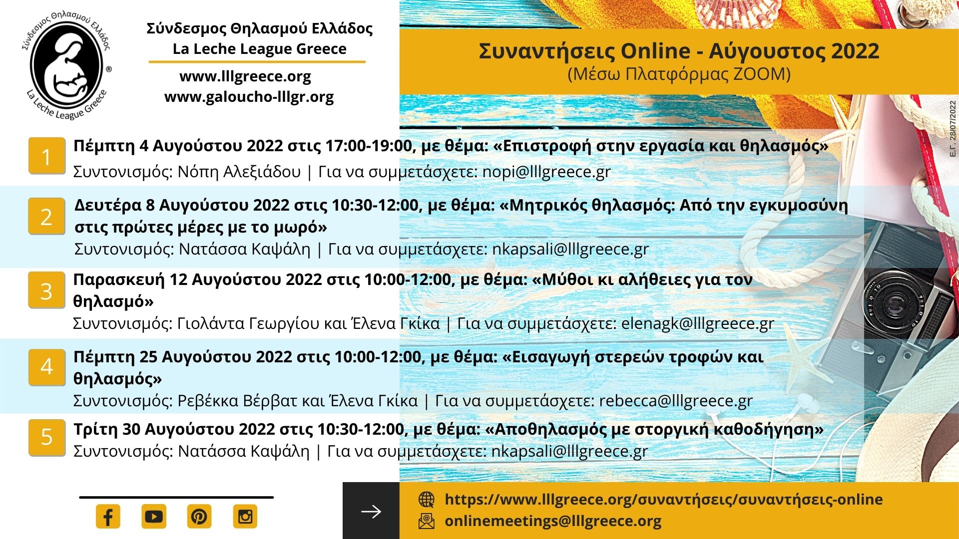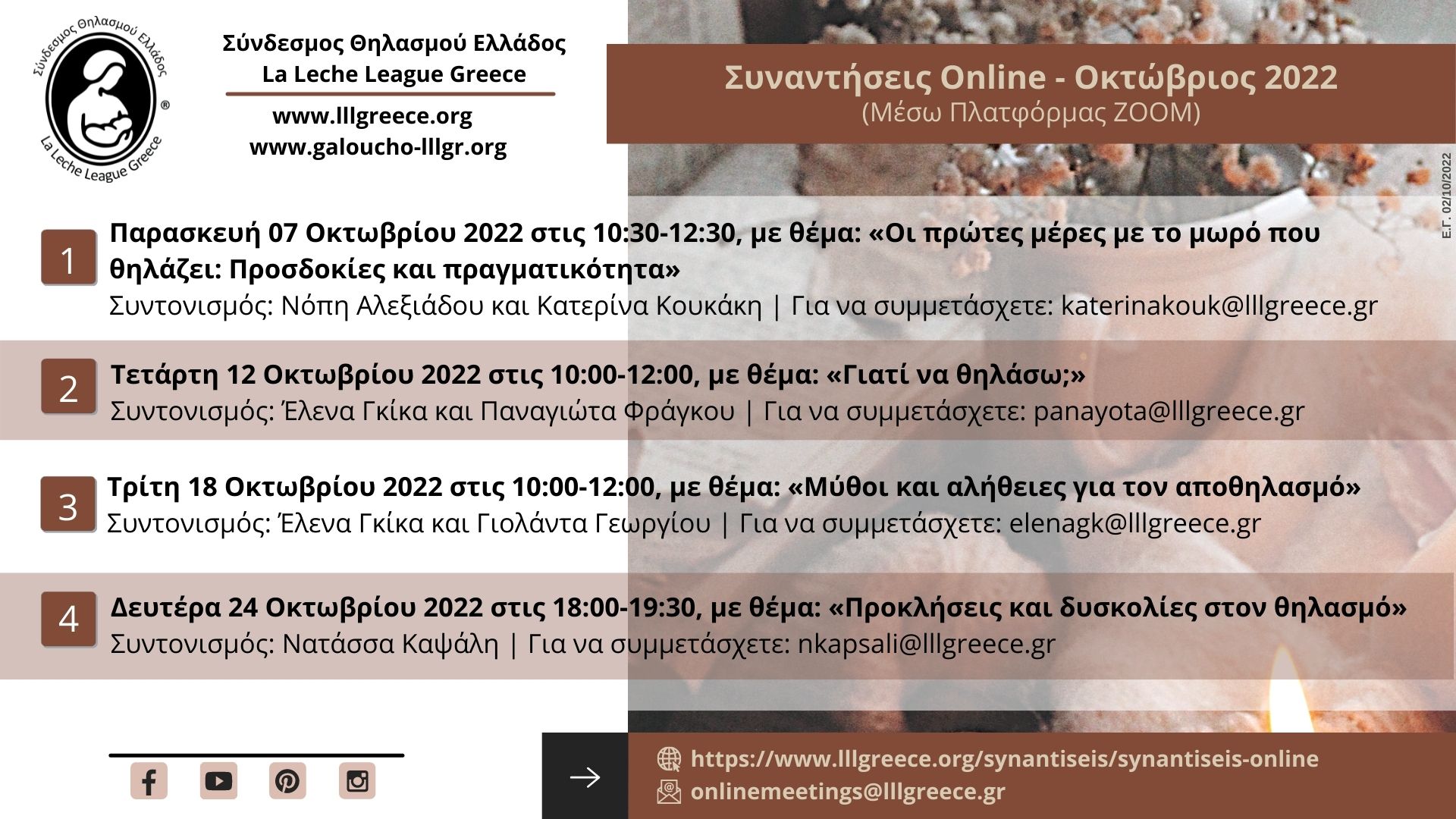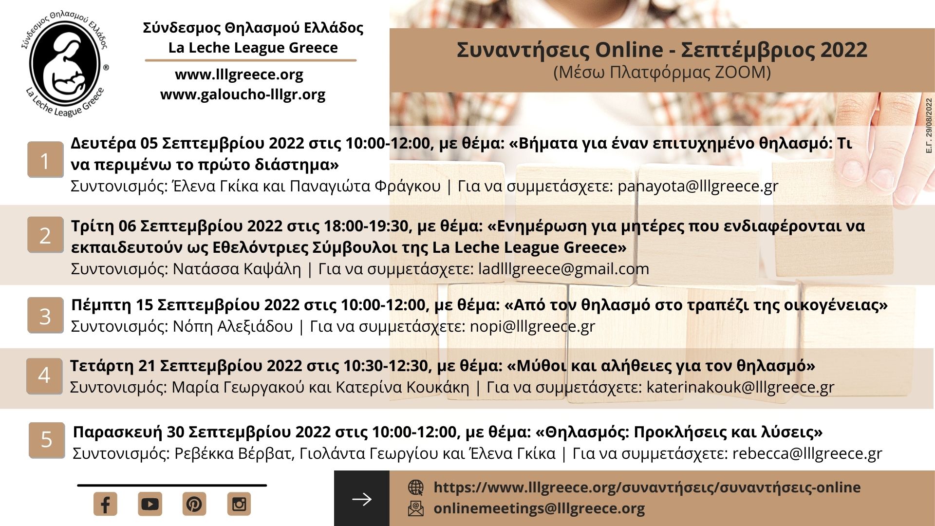 Μπορείτε να δείτε αναλυτικά το μηνιαίο πρόγραμμα των Διαδικτυακών Συναντήσεων του ΣΘΕ-LLLGR εδώ: www.lllgreece.org/synantiseis/synantiseis-online και να μας ακολουθήσετε, αν δεν το κάνετε ήδη, στις επίσημες σελίδες του ΣΘΕ-LLLGR στα Μέσα Κοινωνικής Δικτύωσης (Facebook, Instagram, Pinterest), όπου δημοσιεύονται οι κάρτες προώθησης όλων των Συναντήσεων του Συνδέσμου, τις οποίες μπορείτε να μοιραστείτε στα προσωπικά σας προφίλ, με φίλους ή με όποιον πιστεύετε ότι θα τους φανεί χρήσιμη αυτή η πληροφορία. Η γνώση είναι δύναμη και πρέπει να μοιράζεται!