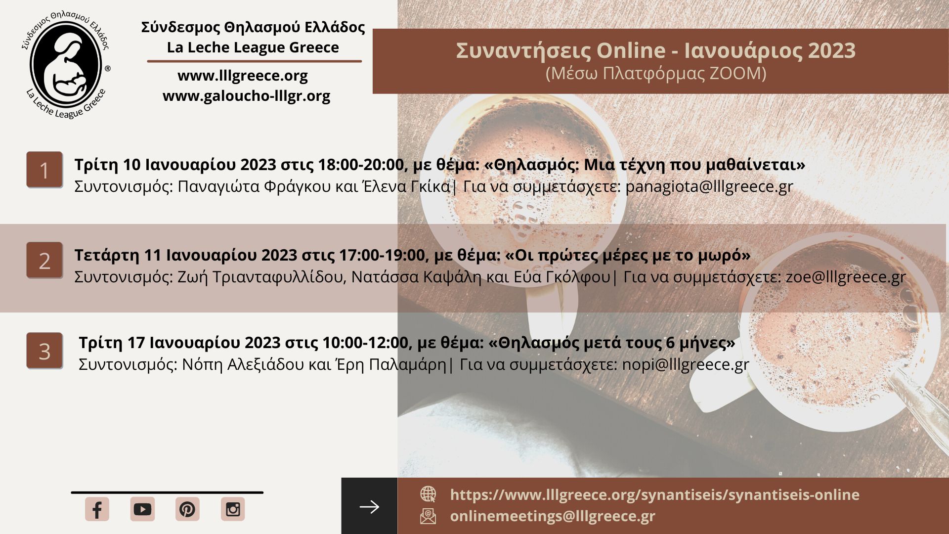 Την περίοδο Αύγουστος 2022–Ιανουάριος 2023 πραγματοποιήθηκαν 26 Διαδικτυακές Συναντήσεις μέσω της πλατφόρμας zoom. Κατά τη διάρκεια των Διαδικτυακών Συναντήσεων, μοιραστήκαμε εμπειρίες, ανάγκες και συναισθήματα για τον θηλασμό και ακούστηκαν ιδέες για διάφορες προκλήσεις που αντιμετώπιζαν οι μητέρες που συμμετείχαν. Οι απορίες των μητέρων πολλές, αλλά σε κάθε Συνάντηση δίνονταν οι απαραίτητες πληροφορίες, επιστημονικά τεκμηριωμένες, με τη σοφία και την εμπειρία των 65+ χρόνων της La Leche League. Τη συζήτηση συντόνιζαν οι Σύμβουλοι Θηλασμού LLL, που είναι ειδικά εκπαιδευμένες και έμπειρες θηλάζουσες μητέρες οι οποίες προσφέρουν εθελοντικά τις υπηρεσίες τους.