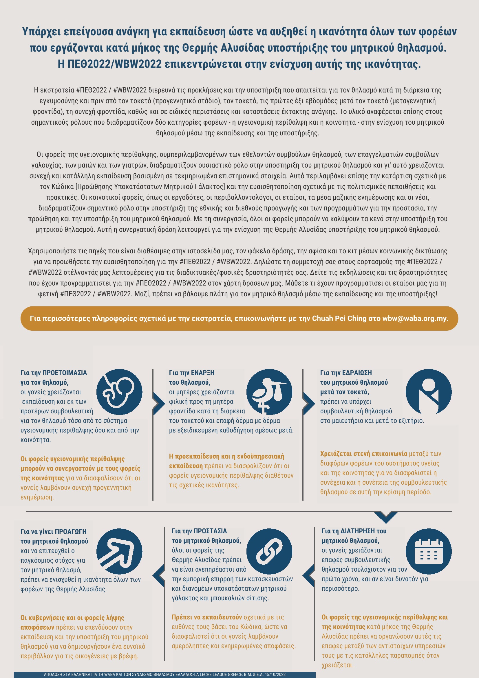 Η #ΠΕΘ2022 επικεντρώθηκε στην ενίσχυση της ικανότητας των φορέων που πρέπει να προστατεύουν, να προωθούν και να υποστηρίζουν τον μητρικό θηλασμό σε διάφορα επίπεδα της κοινωνίας. Οι φορείς αυτοί αποτελούν τη Θερμή Αλυσίδα υποστήριξης του μητρικού θηλασμού.