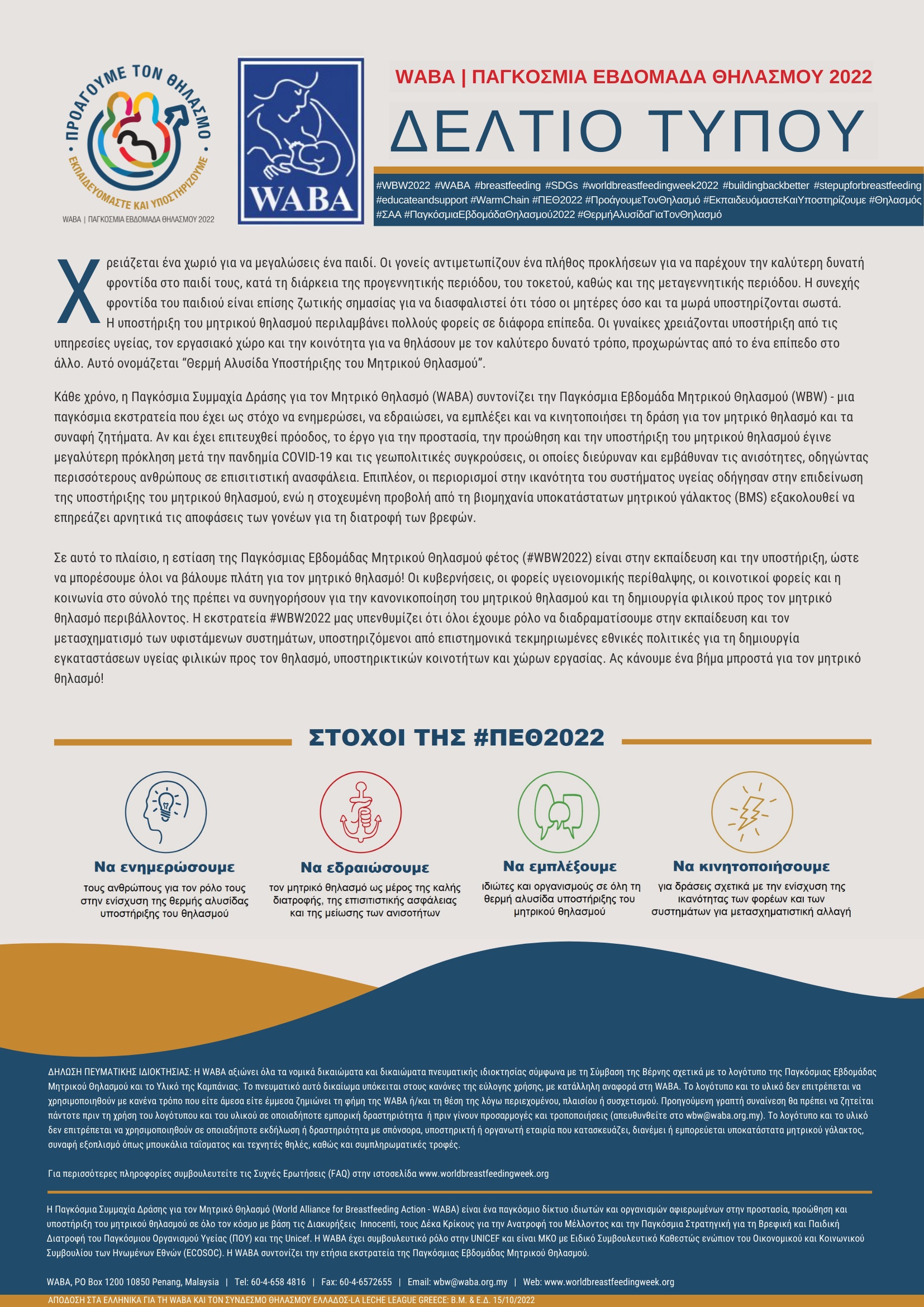 Η WABA αξιώνει όλα τα νομικά δικαιώματα και δικαιώματα πνευματικής ιδιοκτησίας σύμφωνα με τη Σύμβαση της Βέρνης σχετικά με τα λογότυπα της Παγκόσμιας Εβδομάδας Μητρικού Θηλασμού και συγκεκριμένα για το λογότυπο της Παγκόσμιας Εβδομάδας Μητρικού Θηλασμού 2022 (ΠΕΘ2022). Το δικαίωμα αναπαραγωγής υπόκειται στους κανόνες της εύλογης χρήσης, με κατάλληλη αναφορά στη WABA. Το λογότυπο μπορεί να χρησιμοποιηθεί με προηγούμενη γραπτή συναίνεση της WABA για τον εορτασμό της Παγκόσμιας Εβδομάδας Μητρικού Θηλασμούς και για άλλες εκδηλώσεις που σχετίζονται με την προστασία, την προώθηση και την υποστήριξη του μητρικού θηλασμού. Το λογότυπο και η αφίσα δεν επιτρέπεται να χρησιμοποιηθούν με κανένα τρόπο που είτε άμεσα είτε έμμεσα ζημιώνει τη φήμη της WABA ή/και τη θέση της λόγω περιεχομένου, πλαισίου ή συσχετισμού. Προηγούμενη γραπτή συναίνεση θα πρέπει να ζητείται πάντοτε πριν από τη χρήση του λογότυπου και της αφίσας σε οποιαδήποτε εμπορική δραστηριότητα (απευθυνθείτε στο wbw@waba.org.my). Το λογότυπο δεν επιτρέπεται να χρησιμοποιηθεί σε οποιαδήποτε εκδήλωση ή δραστηριότητα με σπόνσορα, υποστηρικτή ή οργανωτή εταιρία που κατασκευάζει, διανέμει ή εμπορεύεται υποκατάστατα μητρικού γάλακτος, μπουκάλια ταΐσματος ή τεχνητές θηλές.