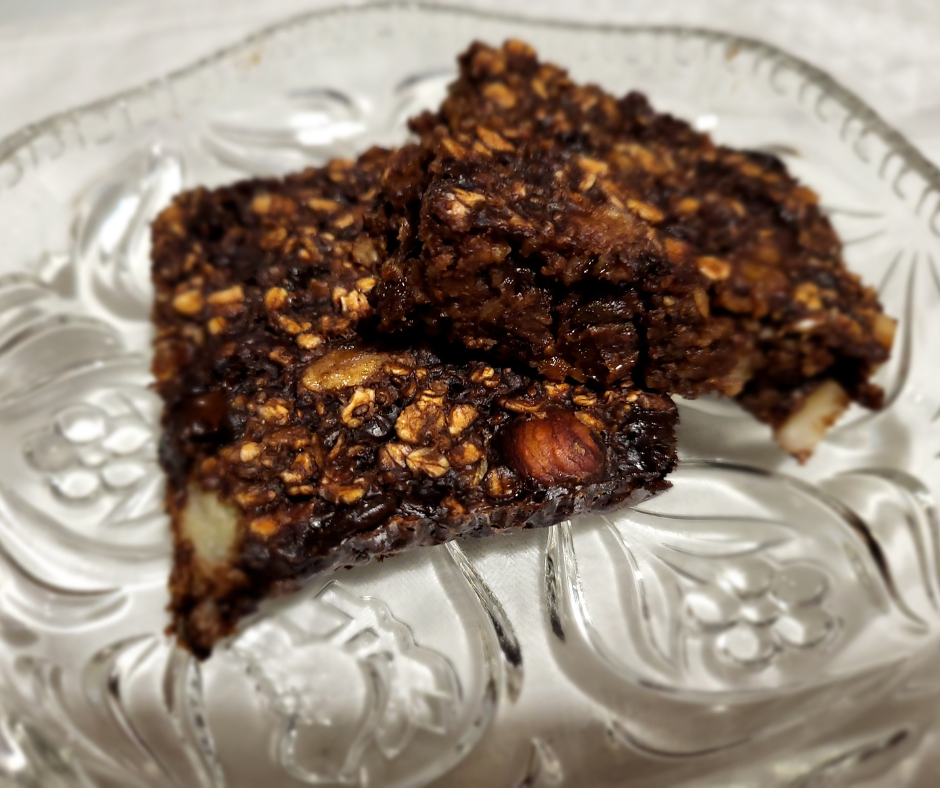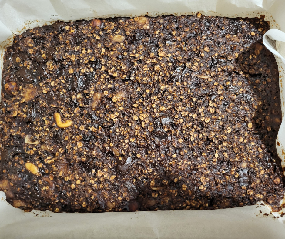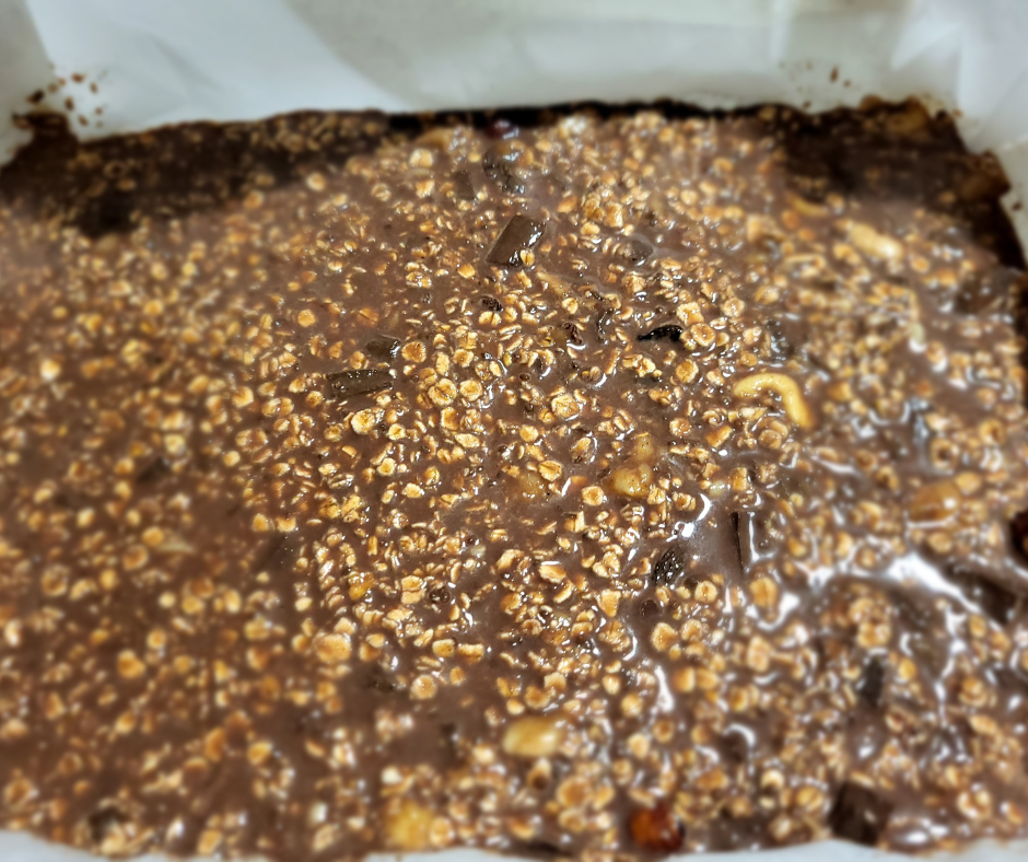 Σε ένα μπολ βάζω το γάλα, το κακάο, το σιρόπι, τις βανίλιες και το baking powder και ανακατεύω καλά (με αυγοδάρτη ή πιρούνι-δεν είναι απαραίτητο το μίξερ). Προσθέτω τη βρώμη και αφήνω το μείγμα για 5-10 λεπτά, ώστε να μαλακώσουν οι νιφάδες. Στη συνέχεια προσθέτω όλα τα υπόλοιπα υλικά (είτε τα εναπομείναντα της βασικής εκδοχής, είτε της ενισχυμένης). Ανακατεύω καλά με ένα κουτάλι και τοποθετώ το μείγμα σε πυρέξ που έχω καλύψει με αντικολλητικό χαρτί. Ψήνω σε προθερμασμένο φούρνο στους 180º για 20-25 λεπτά. Βγάζω από τον φούρνο και αφήνω να κρυώσει, οπότε και κόβω σε μικρές μερίδες.