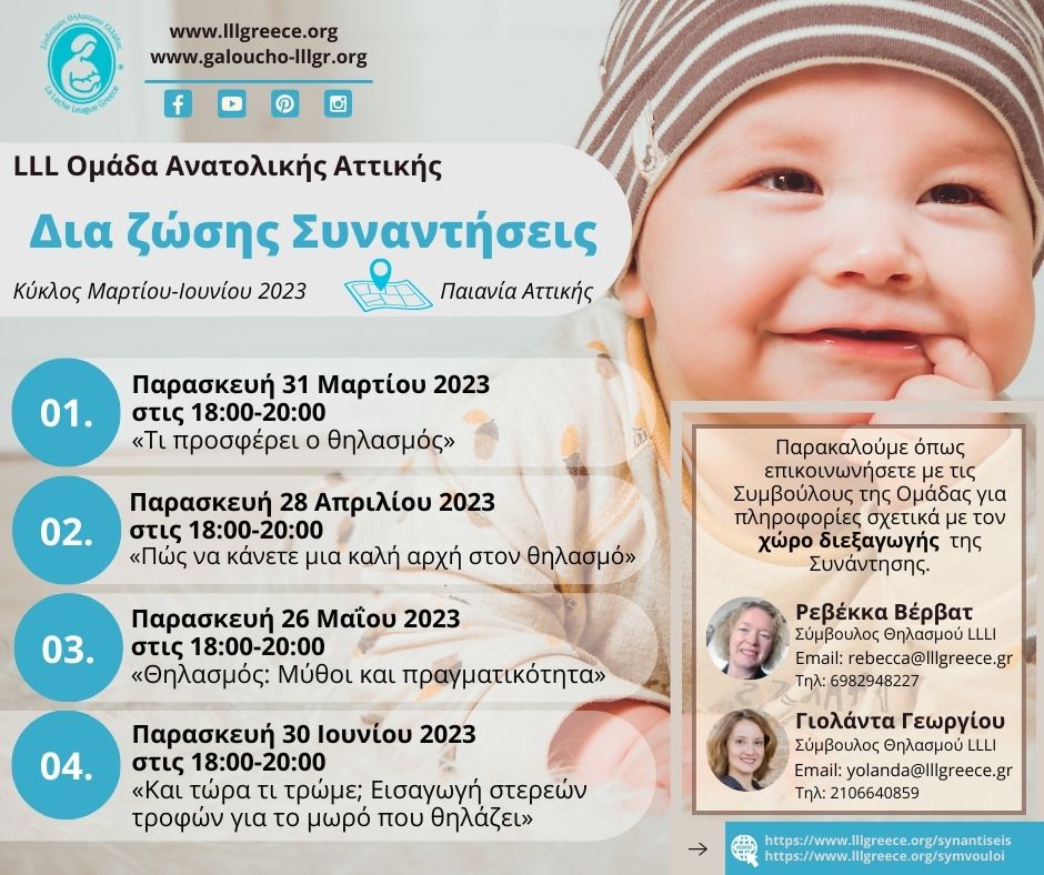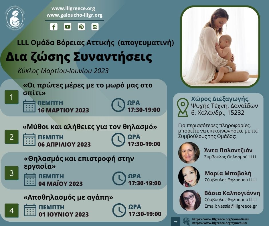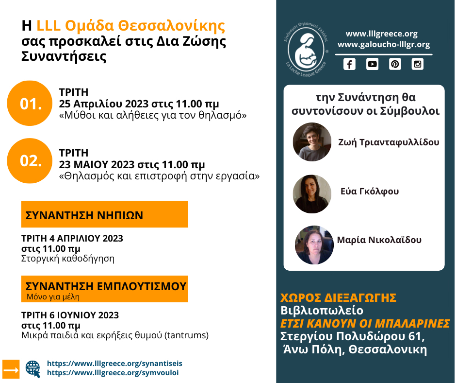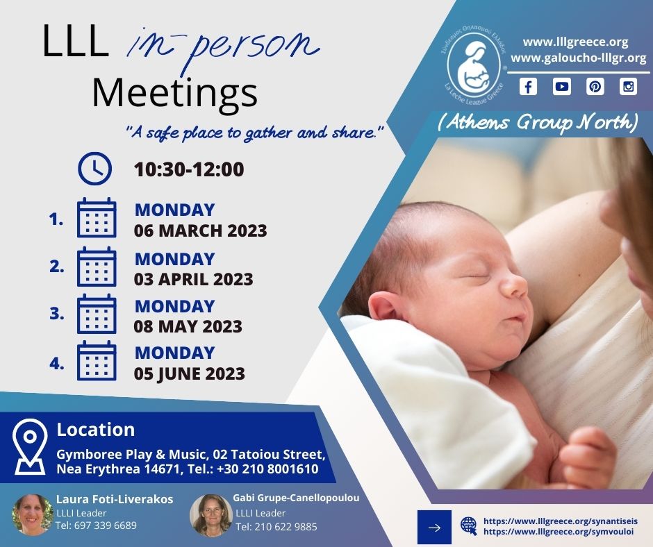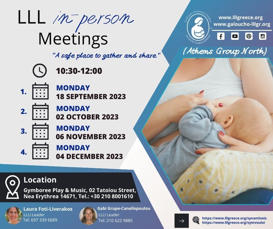 Από τον Φεβρουάριο μέχρι και τον Οκτώβριο 2023, πραγματοποιήθηκαν 25 δια ζώσης Συναντήσεις σε 5 διαφορετικές Ομάδες LLL σε όλη την Ελλάδα, με τις Συμβούλους να καλωσορίζουν παλιά και νέα μέλη με ενσυναίσθηση, κατανόηση και θετική ενέργεια, ενώ έγινε και μια Συνάντηση Νηπίων από την LLL Ομάδα Θεσσαλονίκης!