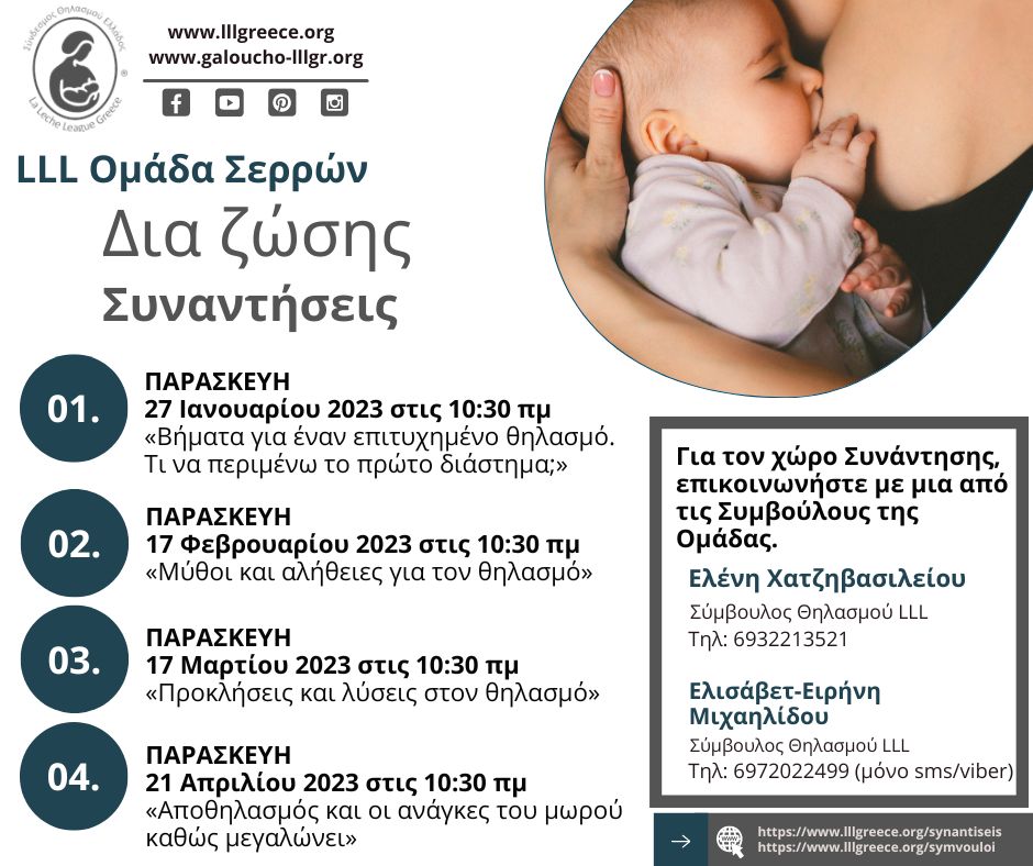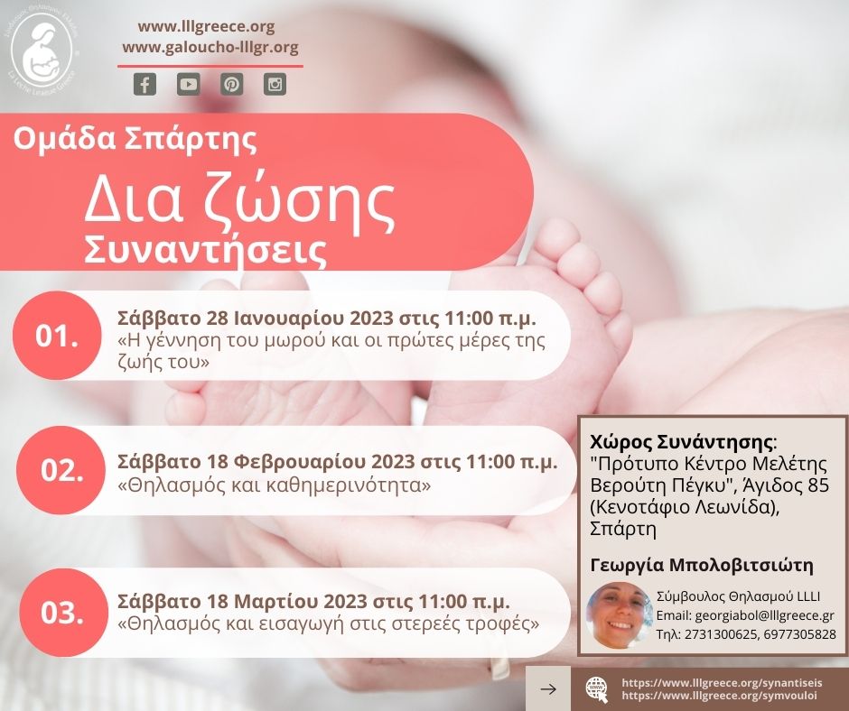 Είσαι έγκυος και αναζητάς πληροφορίες για τον θηλασμό και τη γονεϊκότητα; Είσαι νέα μητέρα που προσπαθεί να μάθει την τέχνη του θηλασμού ή έμπειρη θηλάζουσα μητέρα που αναζητάς ένα περιβάλλον αποδοχής και κατανόησης; θα χαρούμε να σε γνωρίσουμε σε μια από τις επόμενες προγραμματισμένες δια ζώσης Συναντήσεις μας. Οι δια ζώσης Συναντήσεις του ΣΘΕ-LLLGR έχουν τη μορφή κύκλων γονέων, όπου μοιραζόμαστε πληροφορίες σχετικά με τη μητρότητα και τη γαλουχία, και συζητάμε για προκλήσεις που αντιμετωπίζουν οι γονείς των μωρών που θηλάζουν. Αποτελούν έναν ασφαλή χώρο με κατανόηση και αποδοχή στις ανάγκες και τις προκλήσεις που ίσως αντιμετωπίζεις, χωρίς κριτική. Ένας χώρος όπου μπορείς να νιώσεις τη χαρά της υποστήριξης μητέρας προς μητέρα, γονέα προς γονέα, να ενημερωθείς για τις τρέχουσες πληροφορίες για τα θέματα θηλασμού και να γνωρίσεις μητέρες με κοινά ενδιαφέροντα και φιλοσοφία.