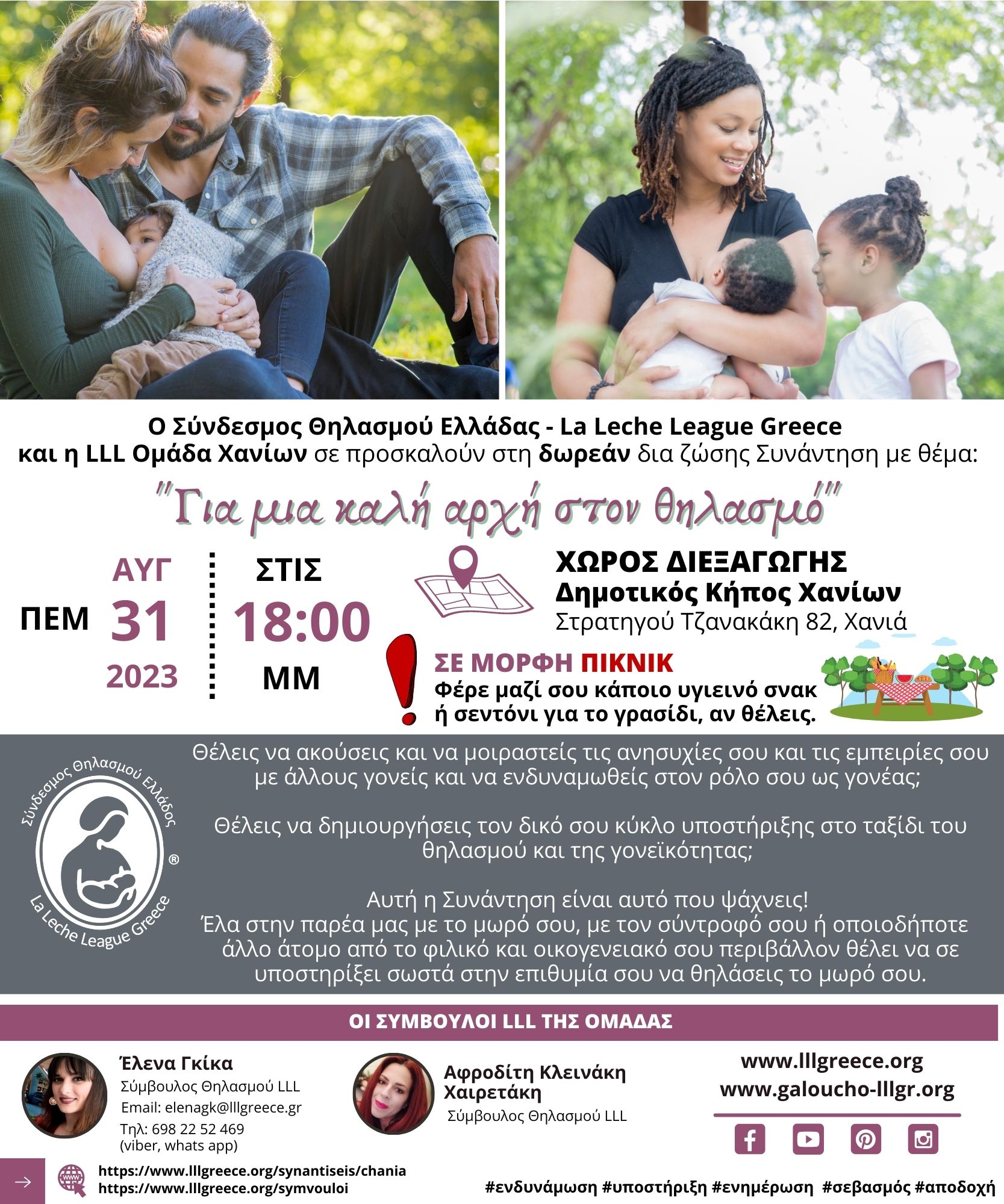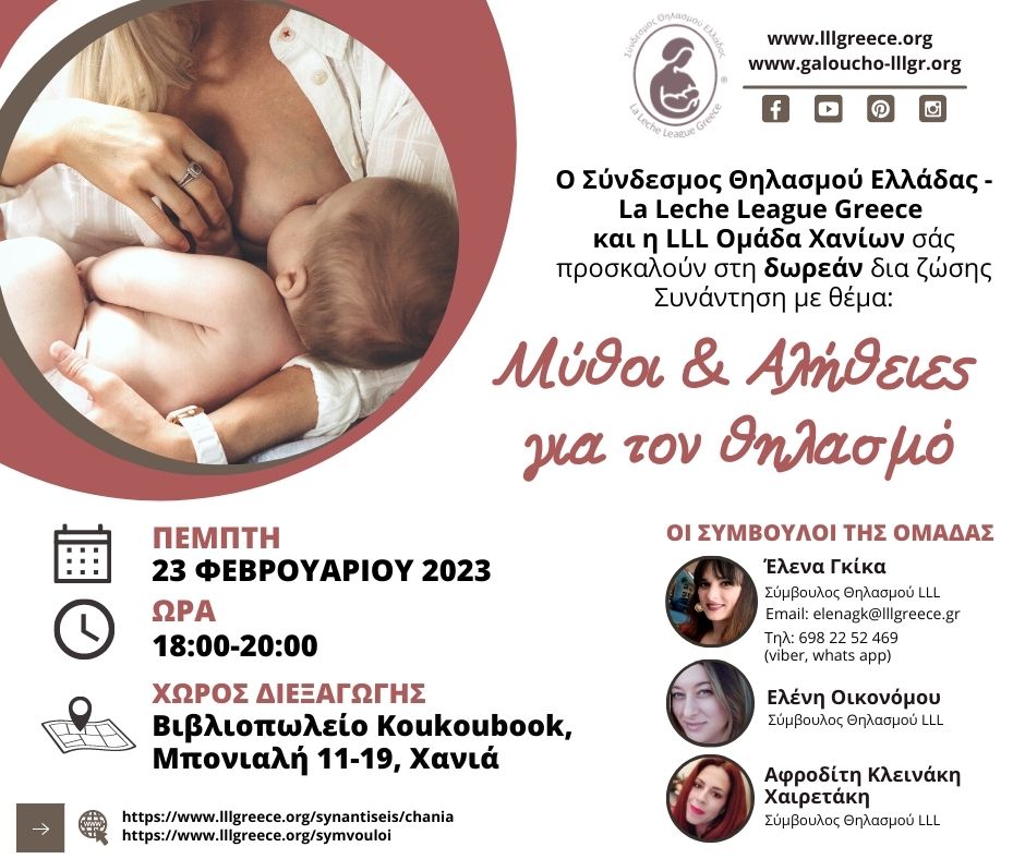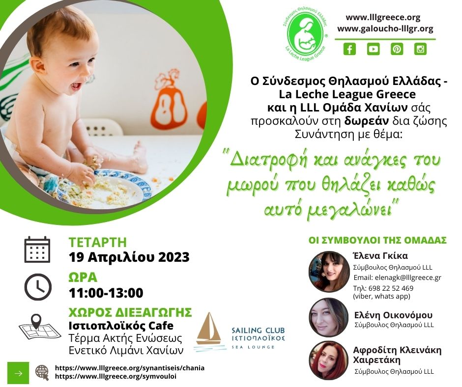 Οι δια ζώσης Συναντήσεις του Συνδέσμου Θηλασμού Ελλάδος – La Leche League Greece είναι δωρεάν και απευθύνονται σε γονείς και μέλλοντες γονείς και όσους στηρίζουν τον μητρικό θηλασμό ή θέλουν να ενημερωθούν γι’ αυτόν. Οι Σύμβουλοι της LLL είμαστε εδώ για όλες τις μητέρες και για όλες τις οικογένειες που χρειάζονται την υποστήριξή μας σχετικά με τον θηλασμό και τη γονεϊότητα, την οποία υποστήριξη προσφέρουμε πάντα εθελοντικά και δωρεάν.