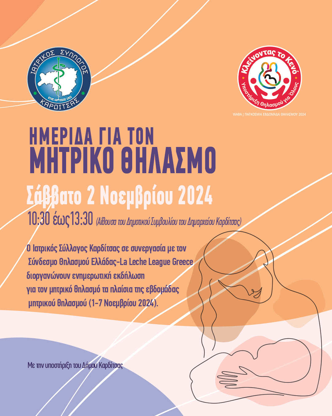 Με αφορμή την Παγκόσμια Εβδομάδα Θηλασμού (1–7 Νοεμβρίου 2024), ο Ιατρικός Σύλλογος Καρδίτσας και ο Σύνδεσμος Θηλασμού Ελλάδος – La Leche League Greece συνδιοργάνωσαν μια ουσιαστική και ζεστή ενημερωτική ημερίδα με θέμα τον μητρικό θηλασμό. Η εκδήλωση πραγματοποιήθηκε το Σάββατο 2 Νοεμβρίου 2024, στην αίθουσα του Δημοτικού Συμβουλίου του Δημαρχείου Καρδίτσας, με την υποστήριξη του Δήμου.